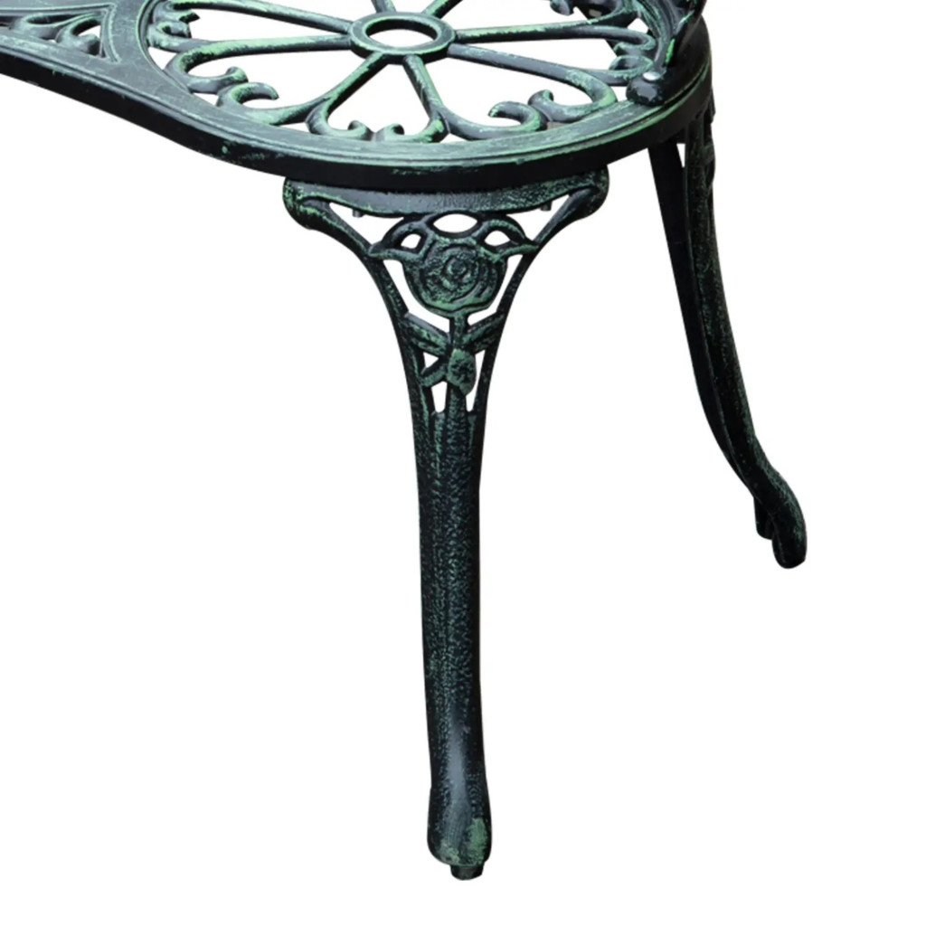 Varázsoljon romantikus, klasszikus hangulatot kertjébe ezzel a gyönyörű kivitelezésű, antik zöld kerti pad modellel. A részletgazdag virágminták és finoman ívelt formák különleges megjelenést kölcsönöznek, így ez a retro stílusú fém kerti pad nemcsak kényelmes ülőhely, hanem a kert dekoratív ékköve is lehet.