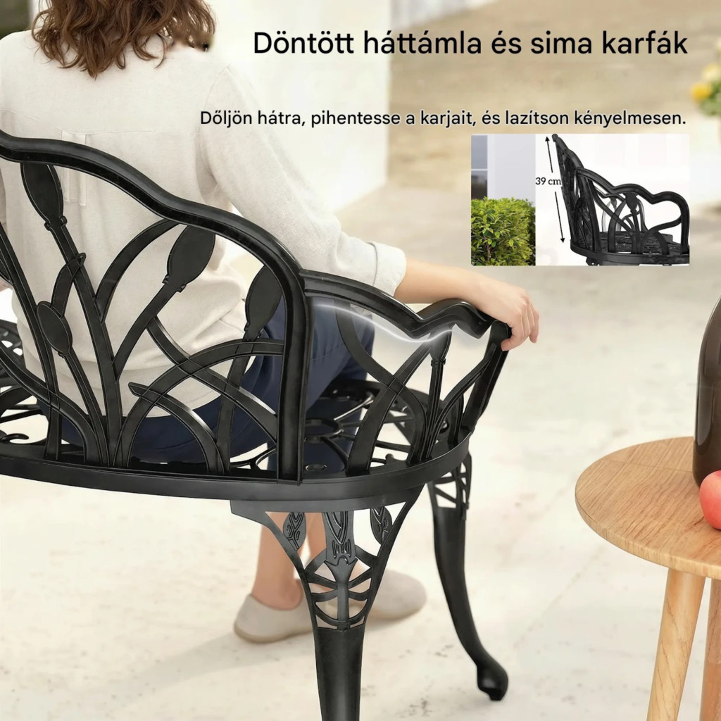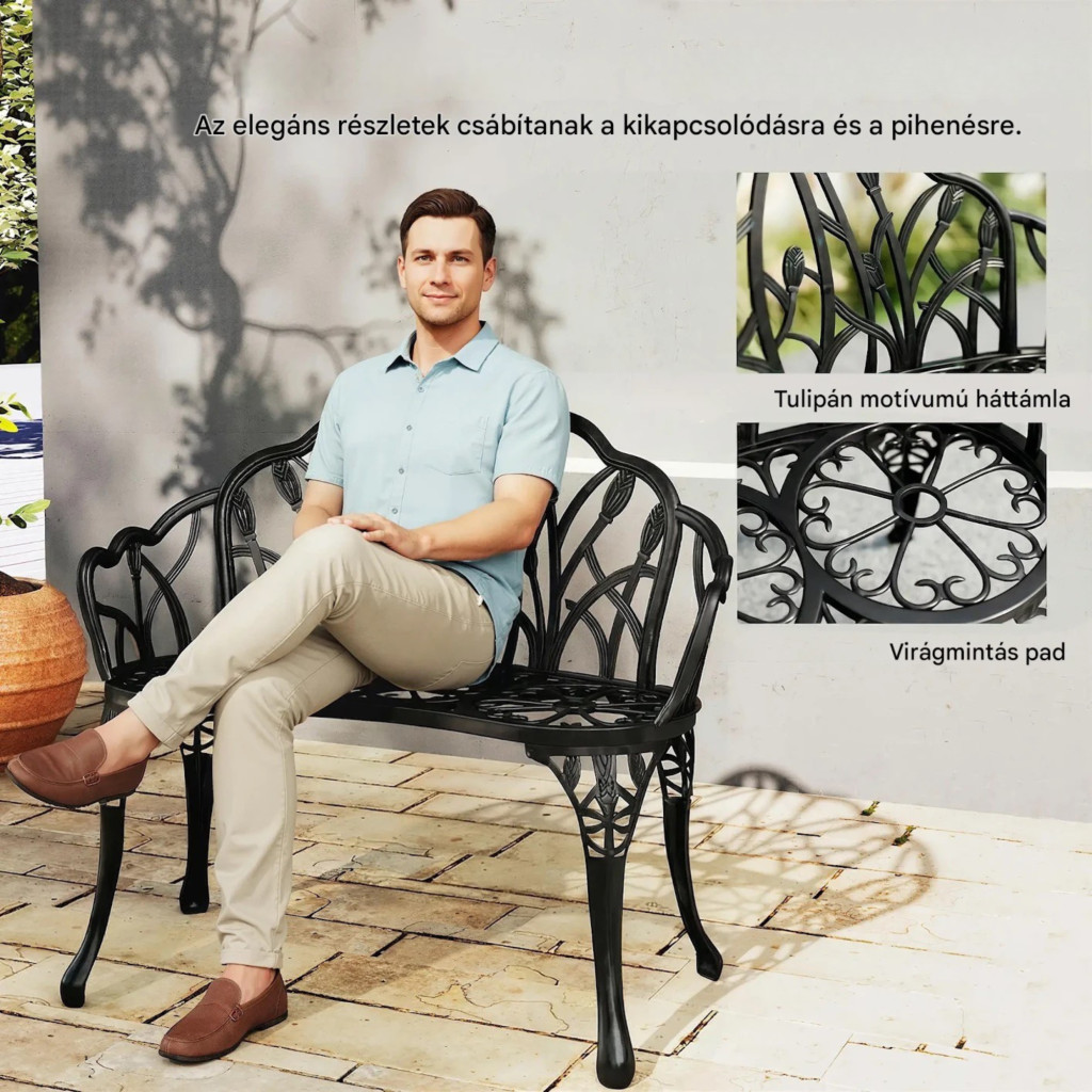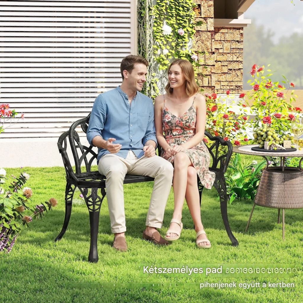 Kerti pad 2 személyes 99x57x78 cm öntött alumínium kerti pad virág mintával, fekete