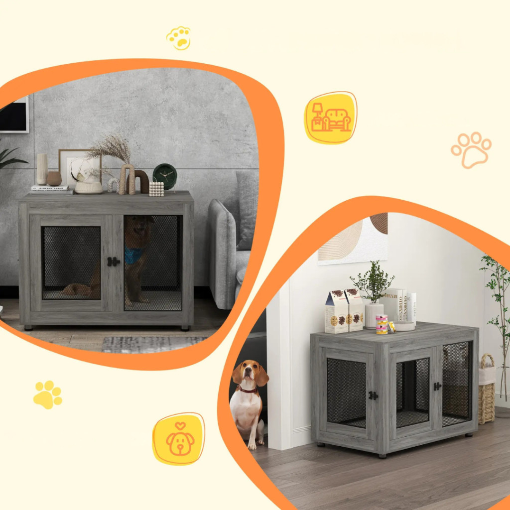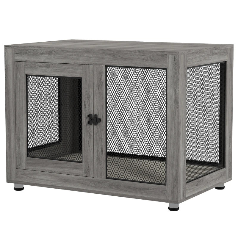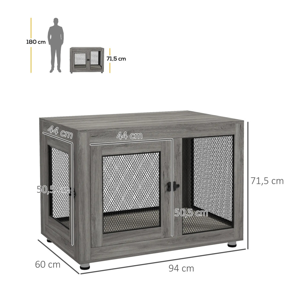Kutya kennel puha szőnyeggel 94x60x71,5 cm szürke kutyaketrec 2 ajtóval kutyabox, zárható