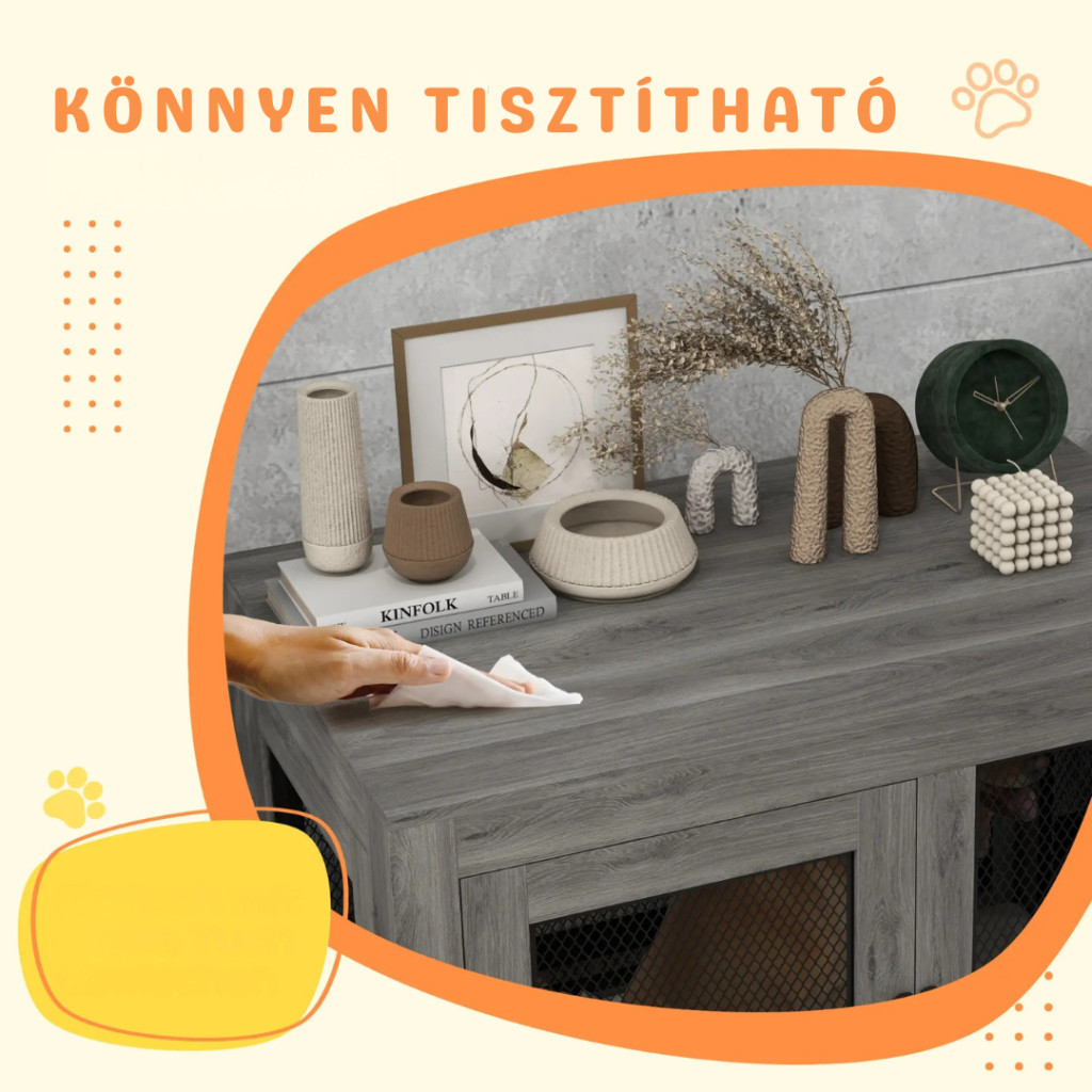 Ez a dekoratív kutyaketrec magas szintű alvási kényelmet biztosít kedvencének a kényelmes, puha szőnyegnek köszönhetően, amelynek huzata könnyen levehető és mosógépben tisztítható. A kutyaház két zárható ajtaja és elegáns acélrácsa megakadályozza, hogy a kiskutyák megszökjenek és veszélyes helyzetbe kerüljenek. Így a kiskutyák biztonságban nőhetnek fel.