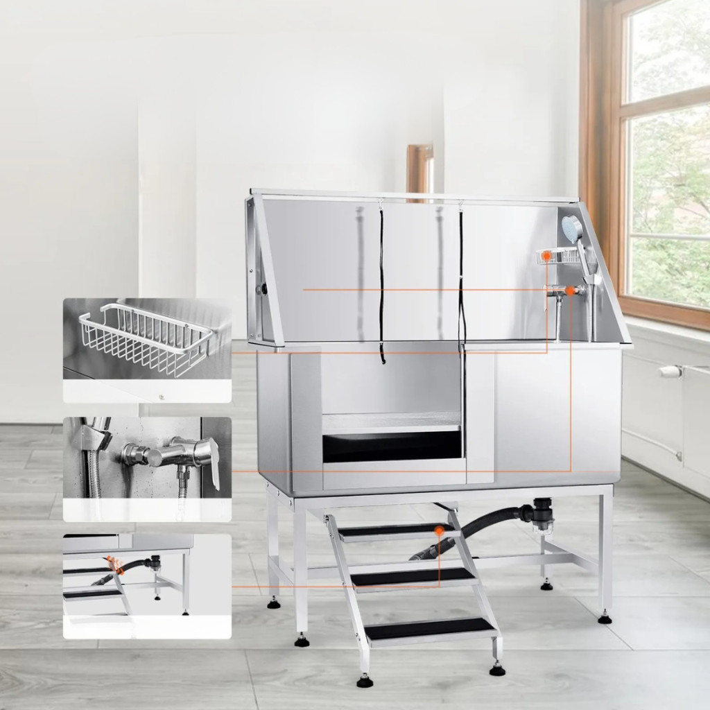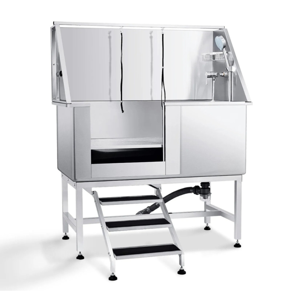 Kutyakozmetikai kád 127 cm rozsdamentes acél kutyafürdető állomás, 150 kg teherbírású bal oldali ajtóval