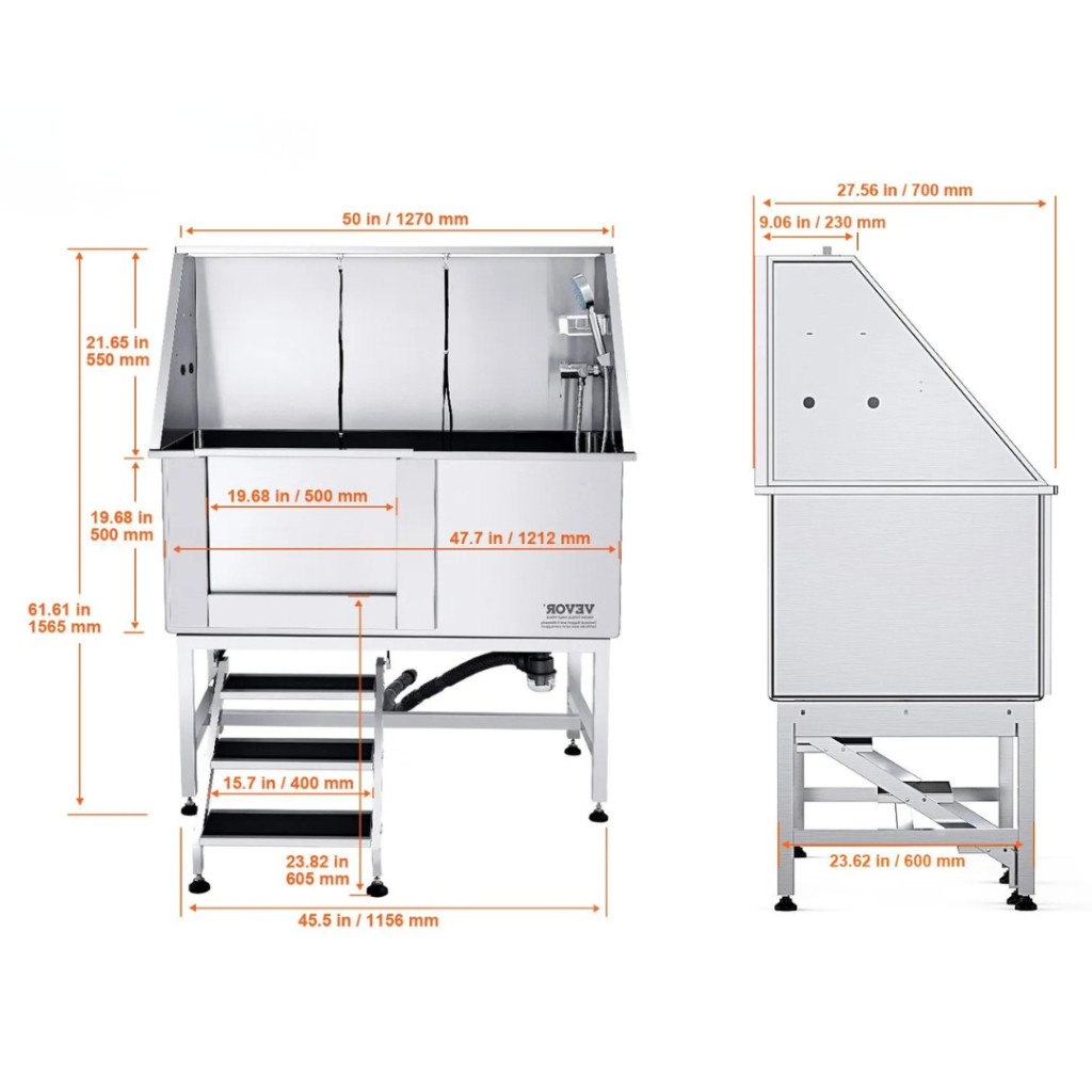 A 127 cm-es kutyafürdető kád hosszú élettartamra készült. Ellenáll a mindennapos használatnak, a víznek és a vegyszereknek. Akár professzionális kutyakozmetikában, akár otthoni környezetben használja, a rozsdamentes acél szerkezet megbízhatóságot és stabilitást nyújt.
