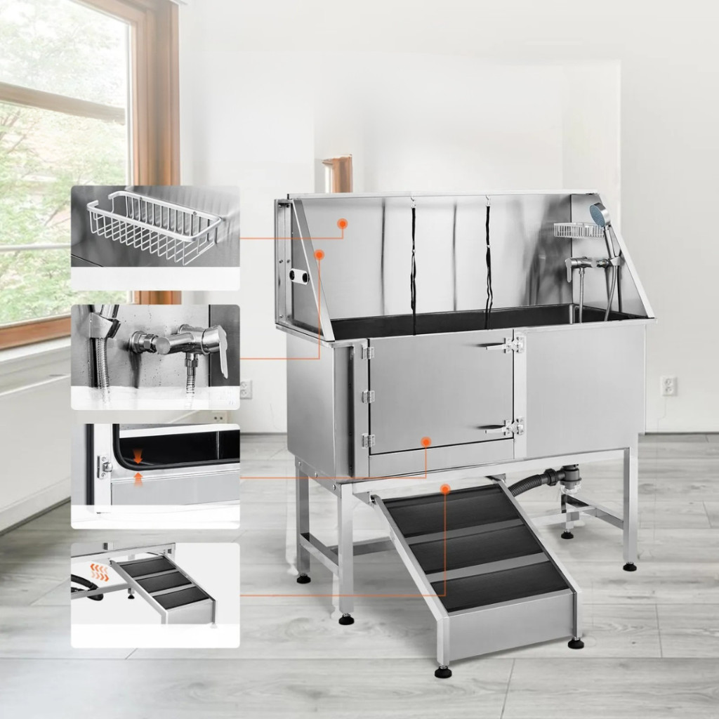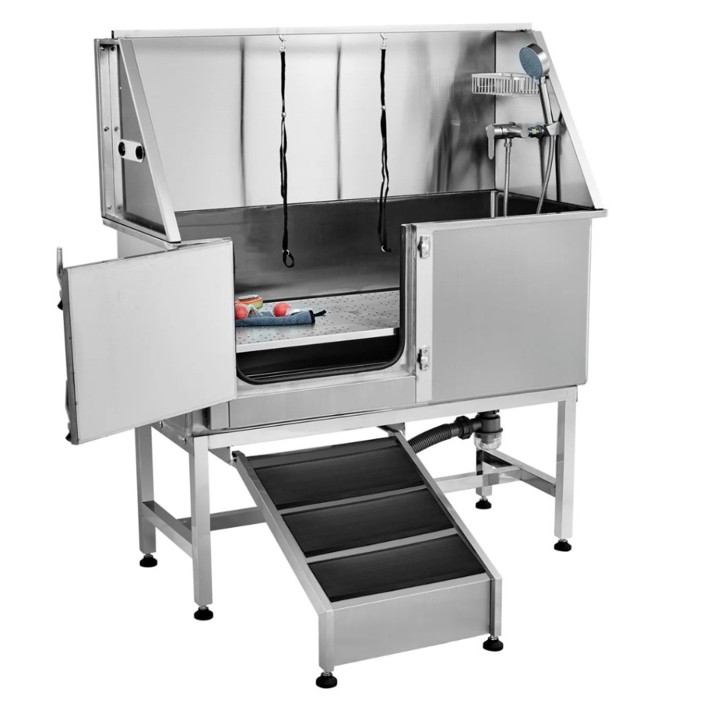 Professzionális kutyakozmetikai kád 127 cm 150 kg teherbírású, bal oldali ajtóval rozsdamentes acél kutyafürdető állomás