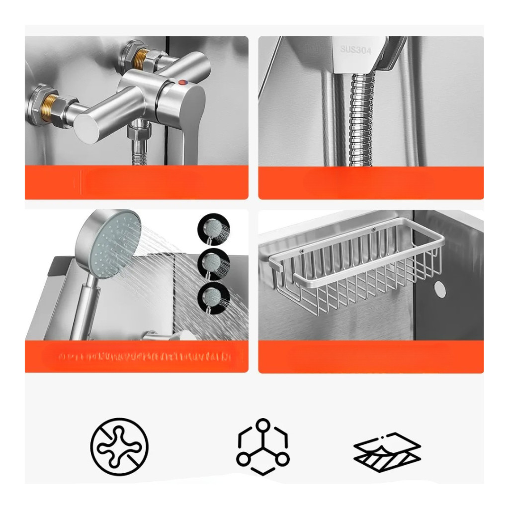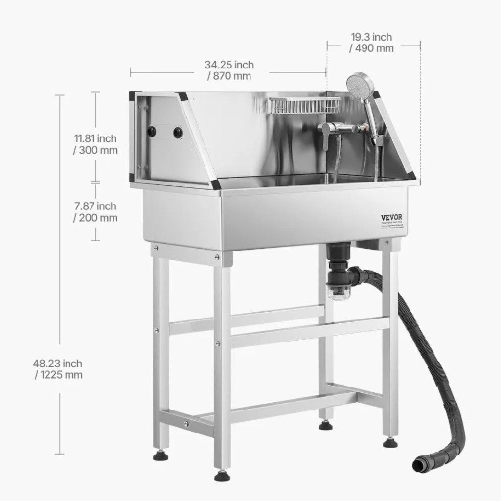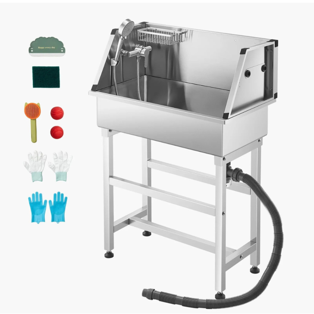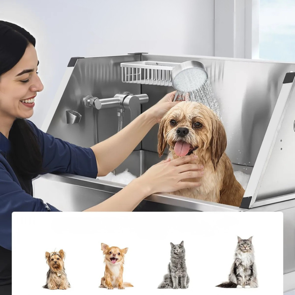 Rozsdamentes acél kutyafürdető kád 87×49×122,5 cm kutyakozmetikai kád vízcsappal, zuhanyfejjel, szappantartóval és játékokkal