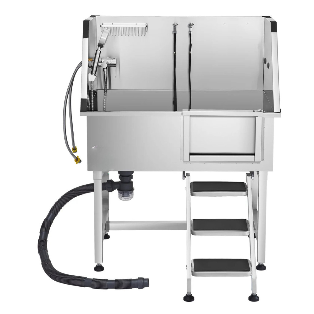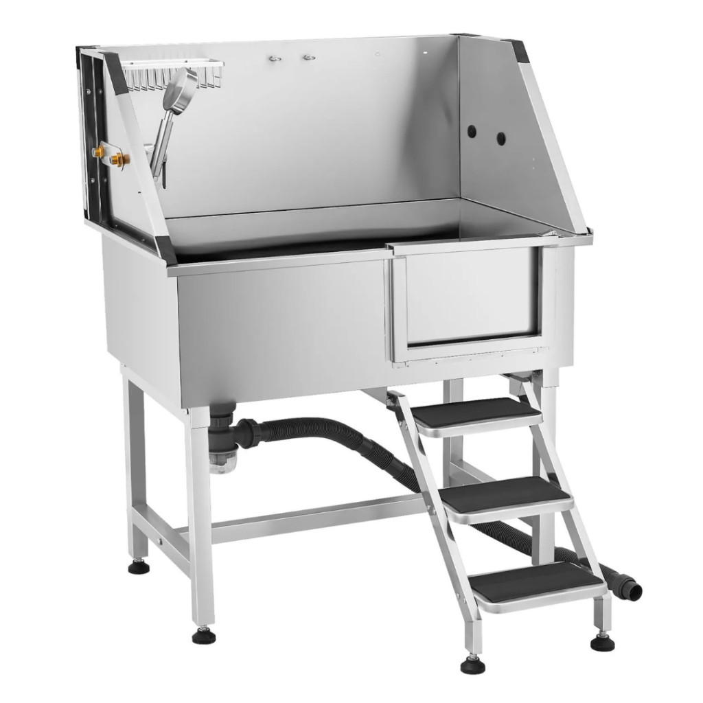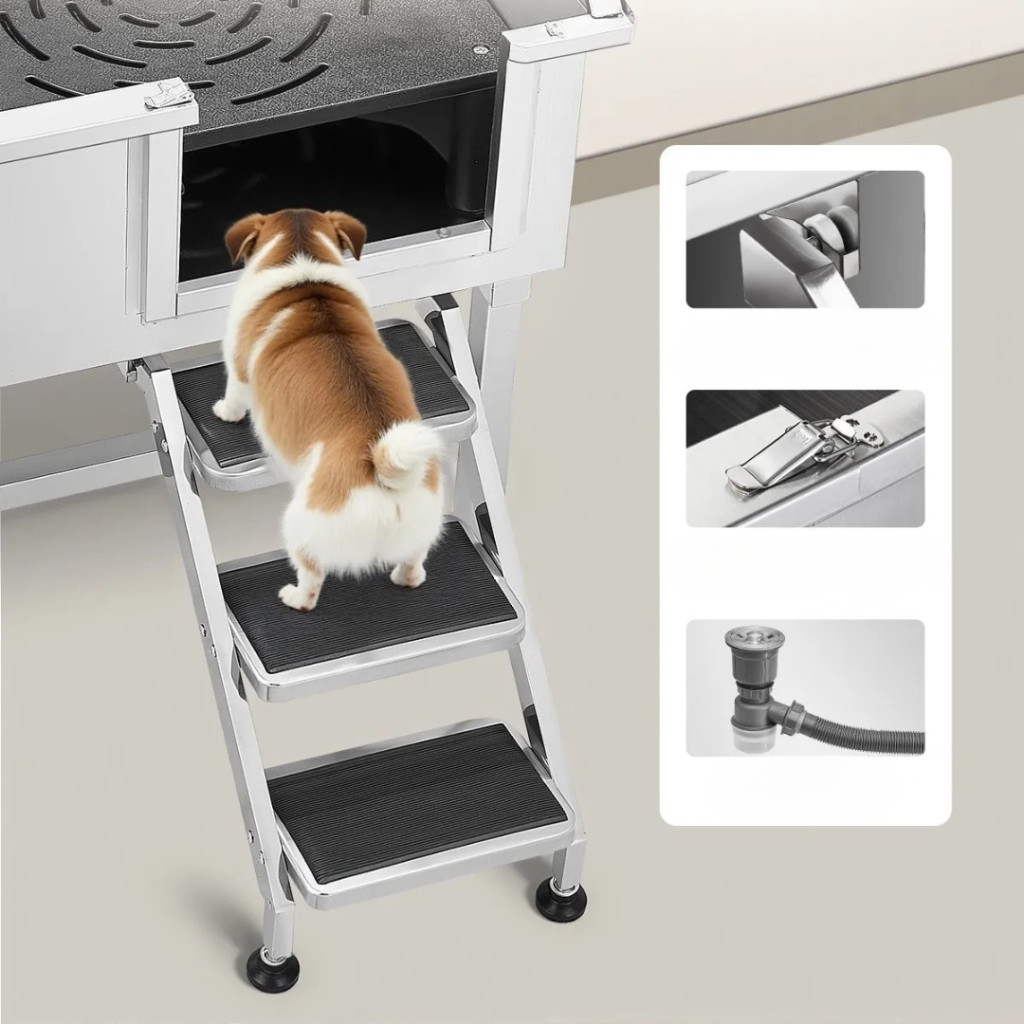 Rozsdamentes acél kutyafürdető kád 96×62×122 cm kutyakozmetikai kád jobb oldali ajtóval lépcsővel