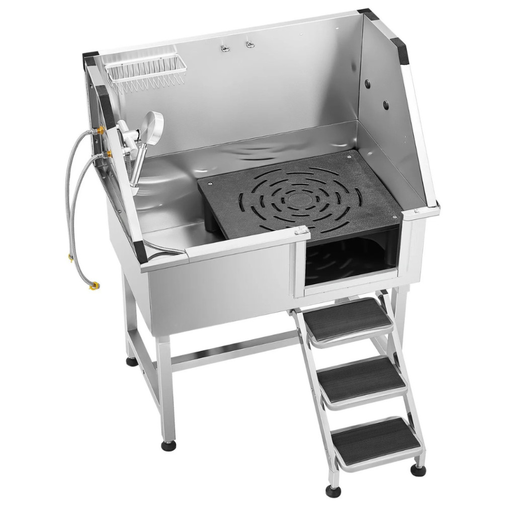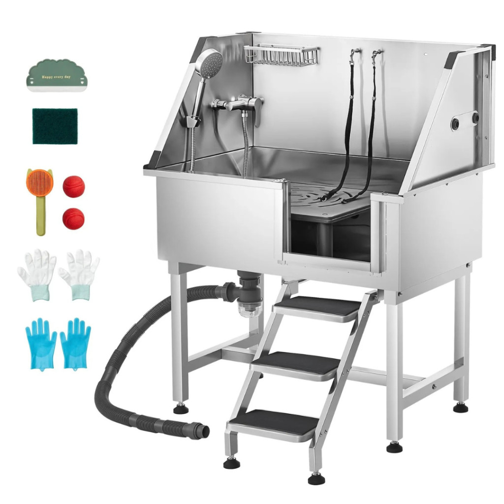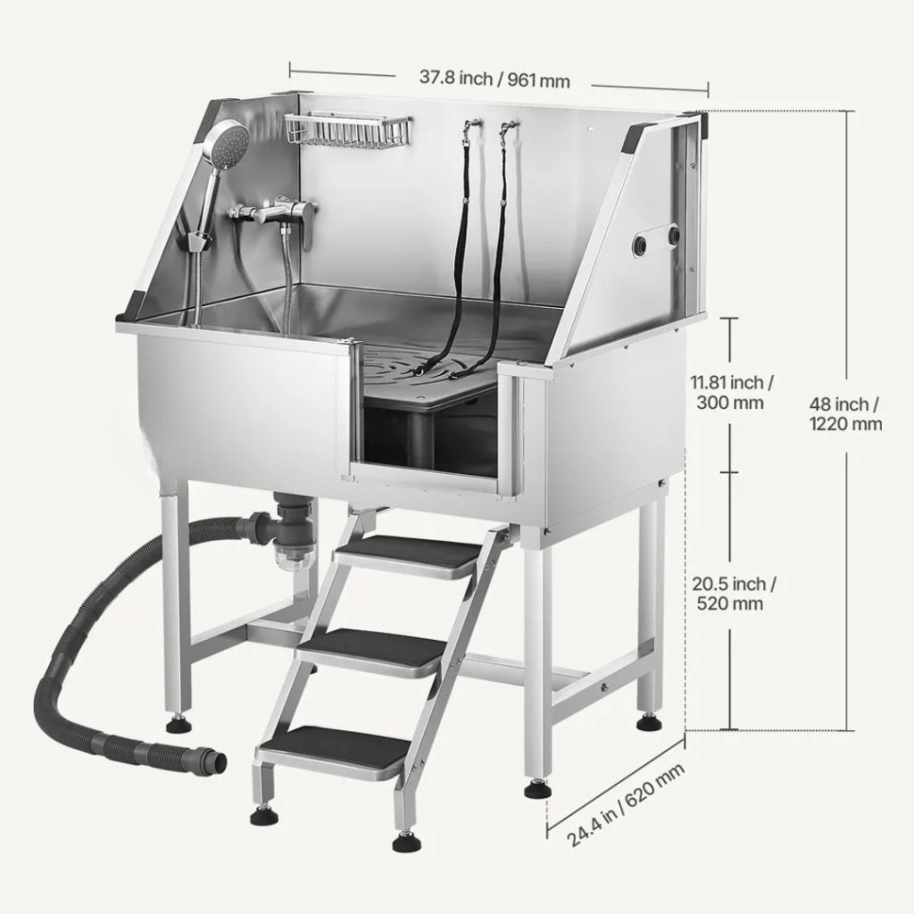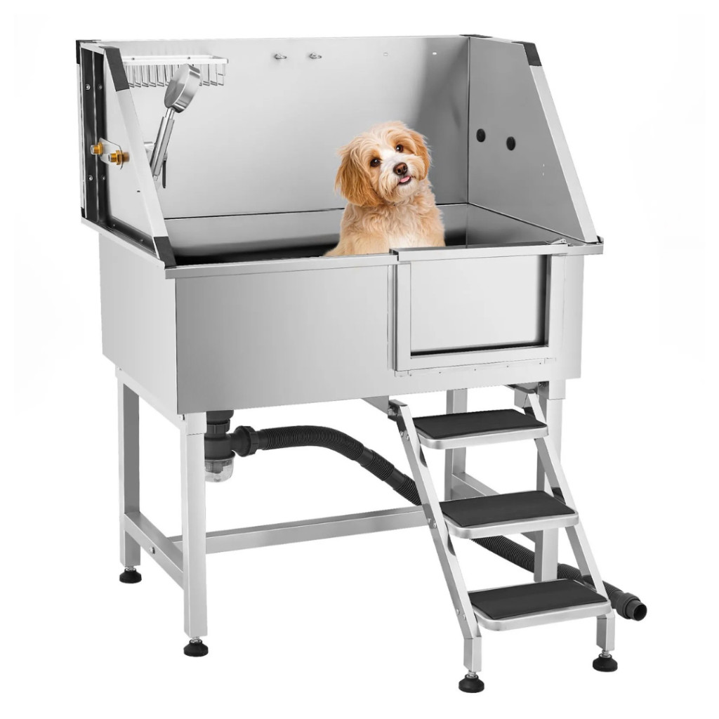 Rozsdamentes acél kutyafürdető kád 96×62×122 cm kutyakozmetikai kád jobb oldali ajtóval lépcsővel