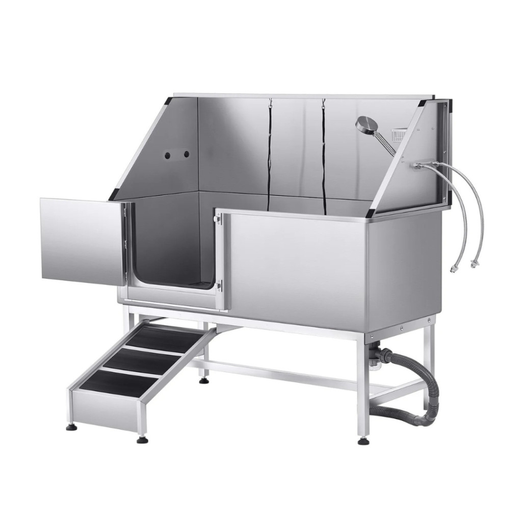 A rozsdamentes acél kutyafürdető kád (modell: K2E01011) a professzionális kutyakozmetikusok és az igényes állattartók számára lett megalkotva.