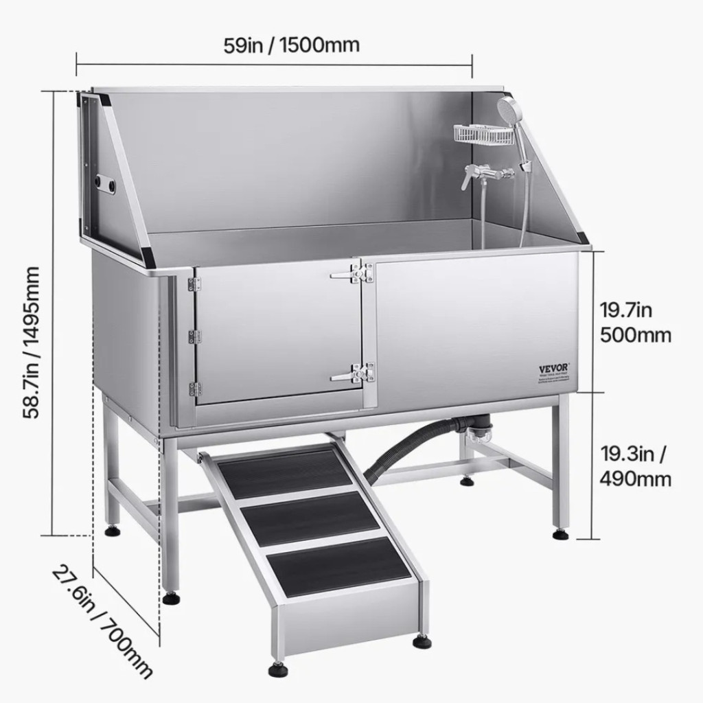 A 150×70×149,5 cm-es méretével ez a professzionális kutyafürdető állomás ideális kis-, közepes- és nagytestű kutyákhoz is, akár 200 kg teherbírásig.