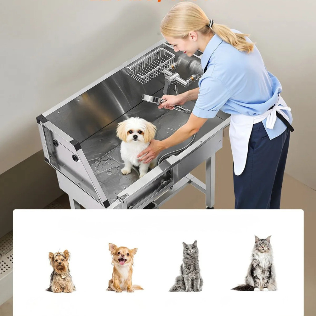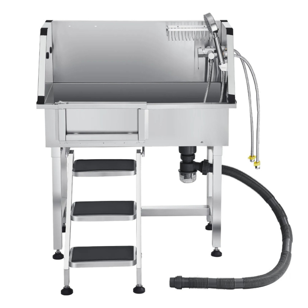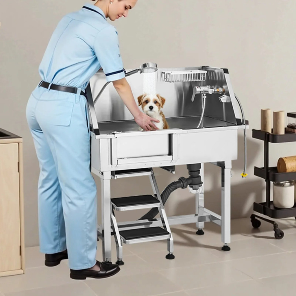 Rozsdamentes acél kutyafürdető állomás 87×49×102 cm kutyakozmetikai kád rámpával, bal oldali ajtóval