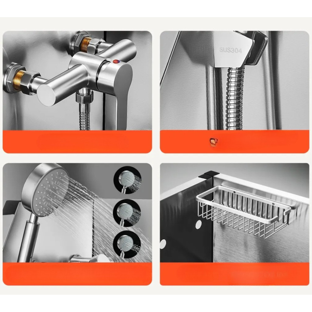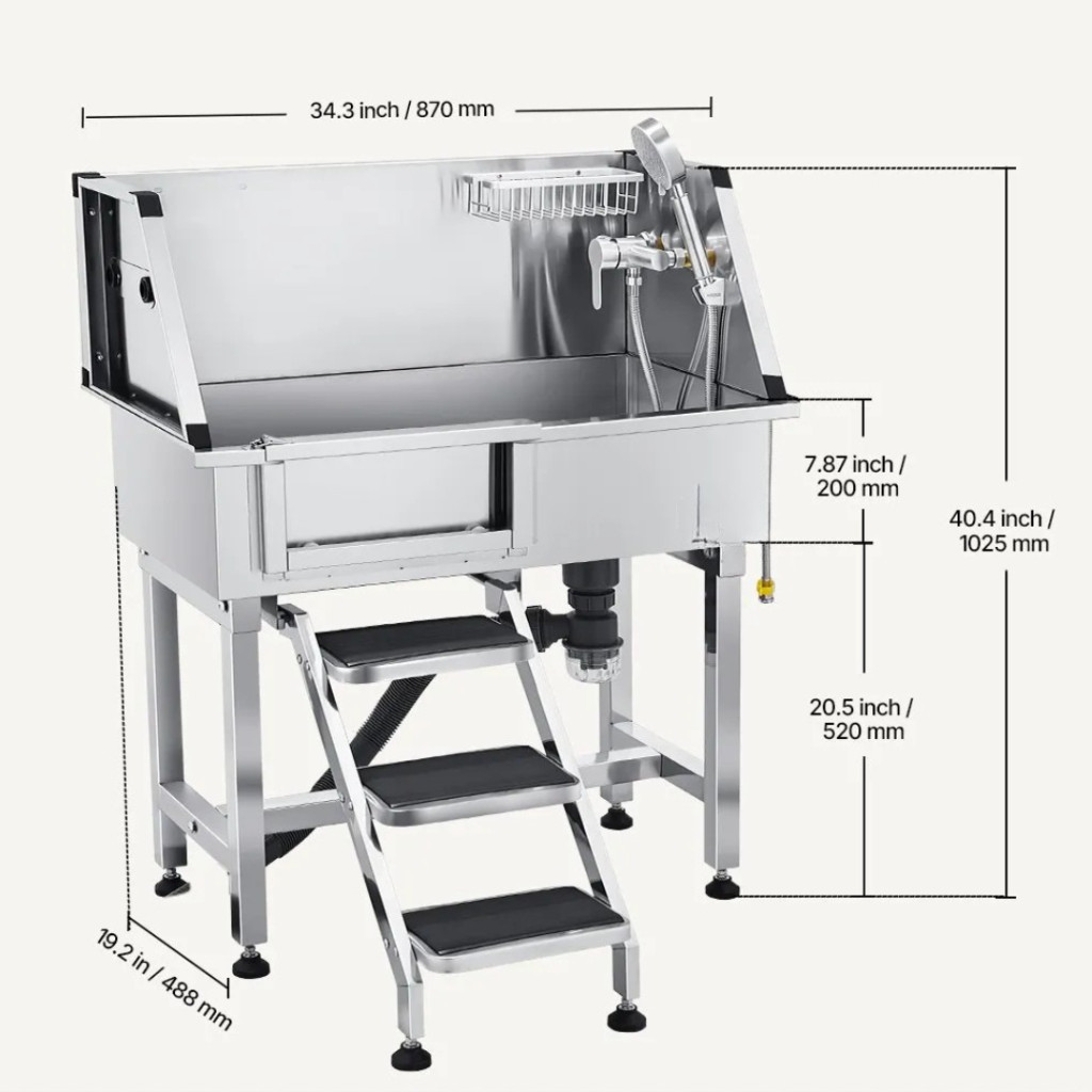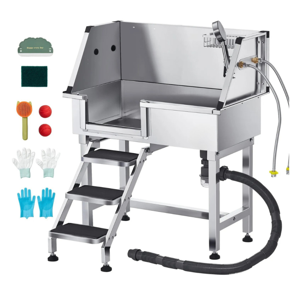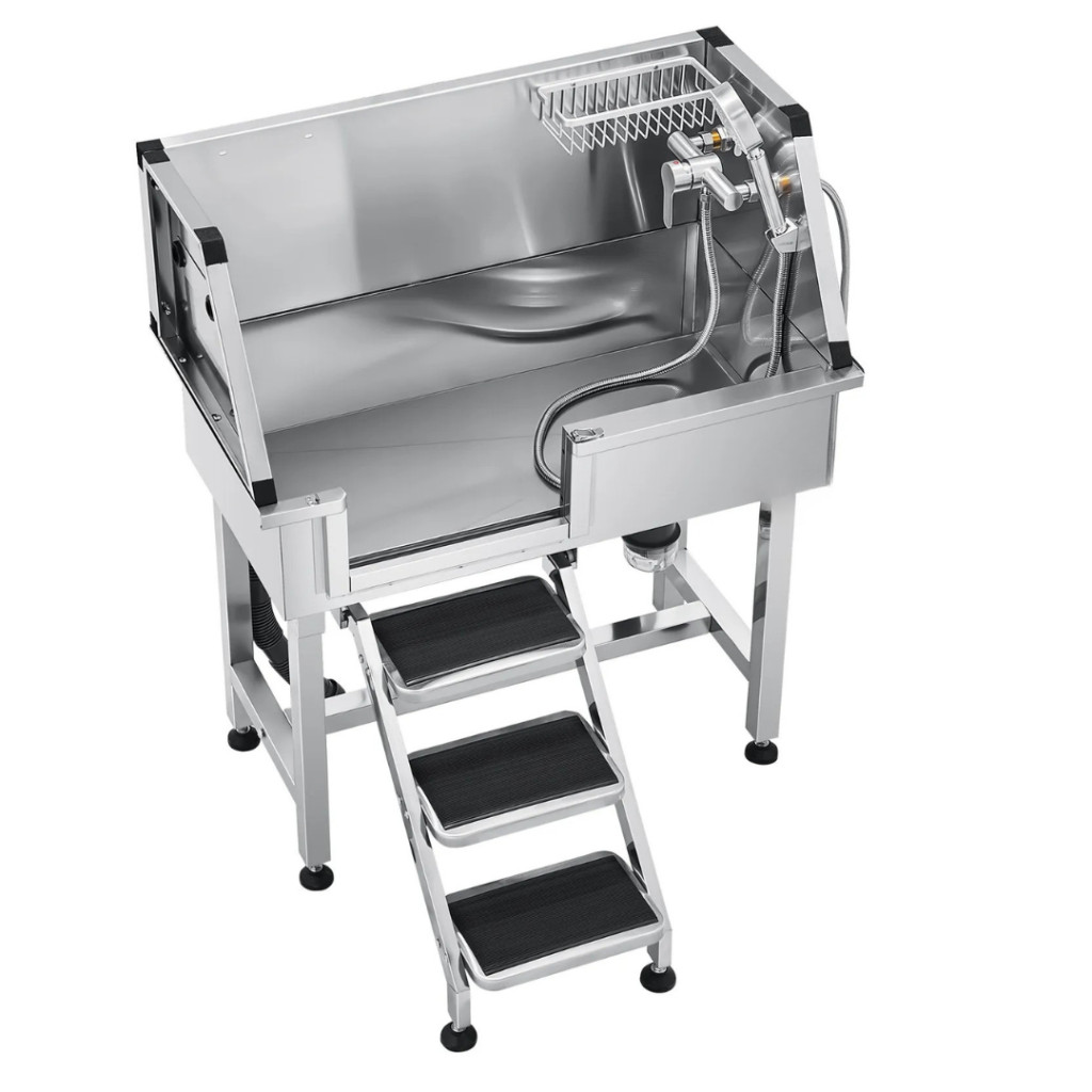 Rozsdamentes acél kutyafürdető állomás 87×49×102 cm kutyakozmetikai kád rámpával, bal oldali ajtóval