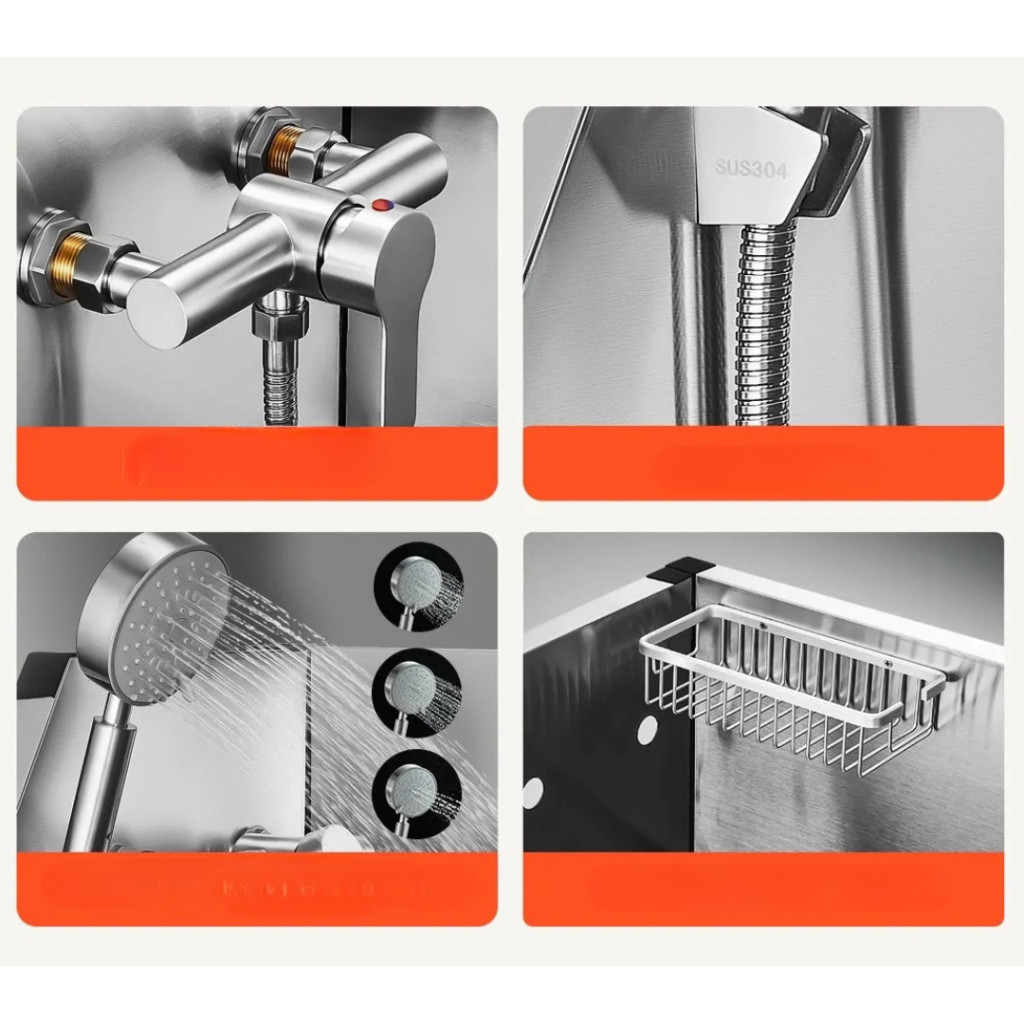 Tartozékok: csaptelep, zuhanyfej, szappantartó, PE vízszűrő rács, törlőkendő, kefe, kesztyű, lehúzó