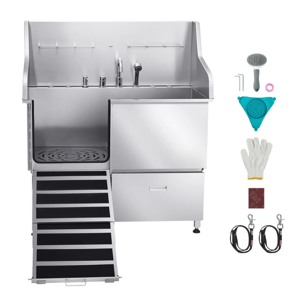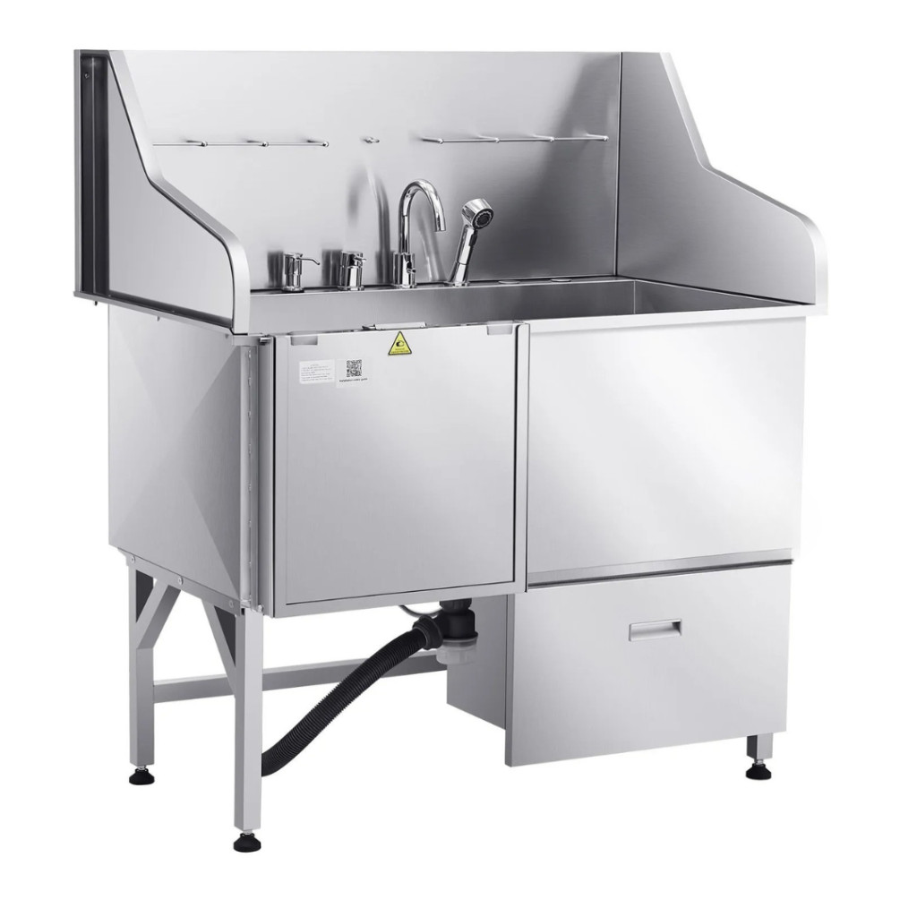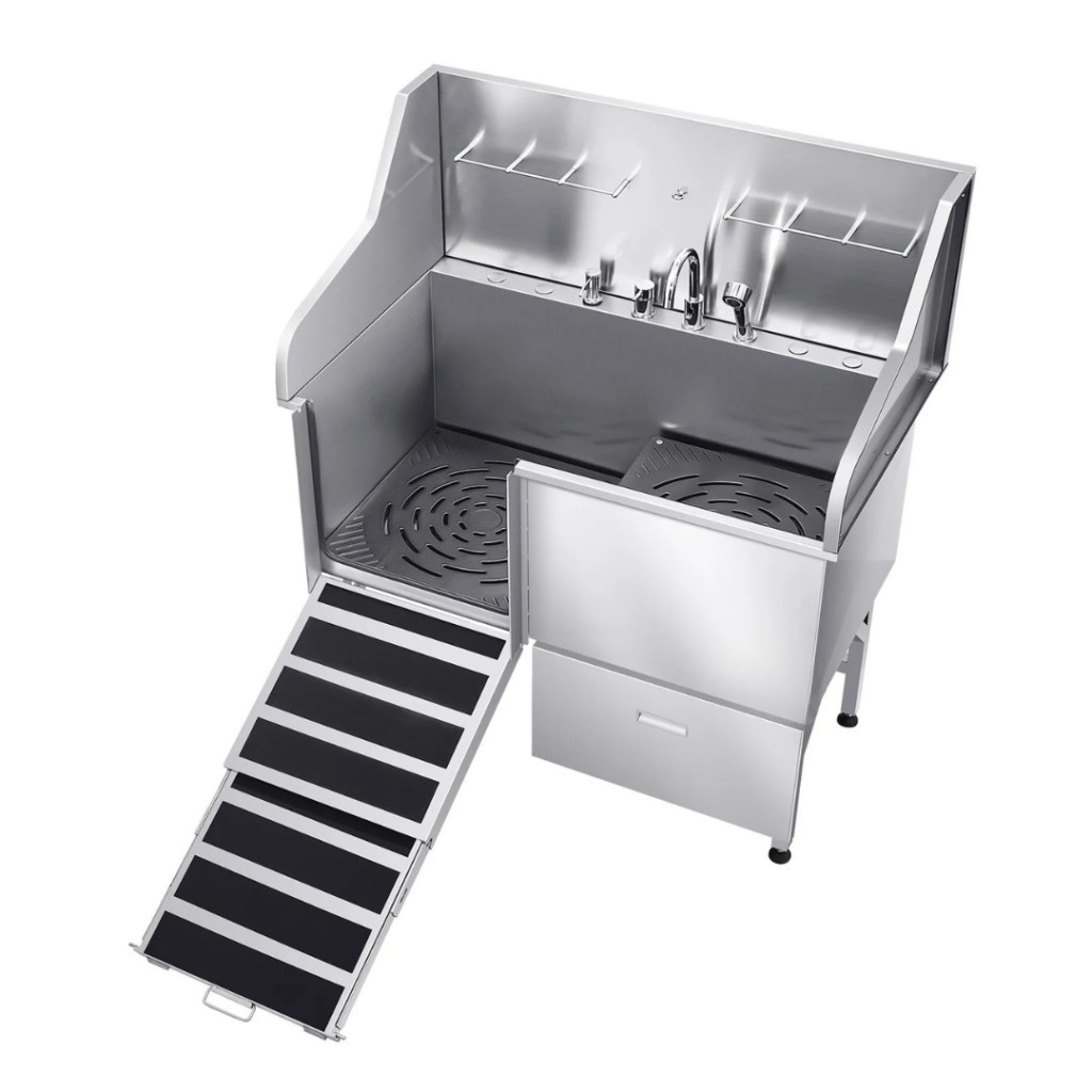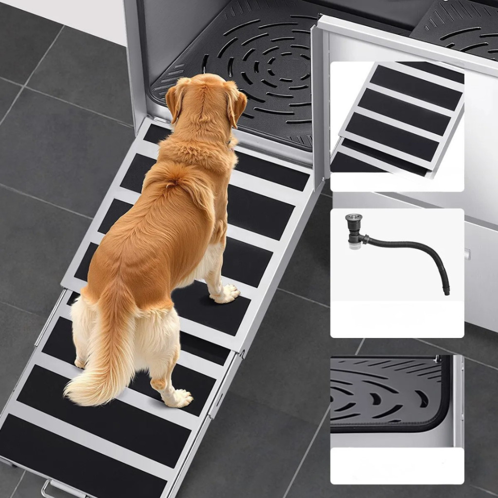 Kutyafürdető állomás 127×79,5×143,5 cm kutyakozmetikai kád rámpával, tárolófiókkal, bal oldali ajtóval