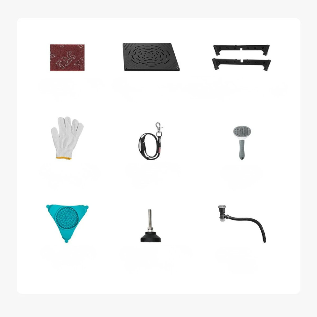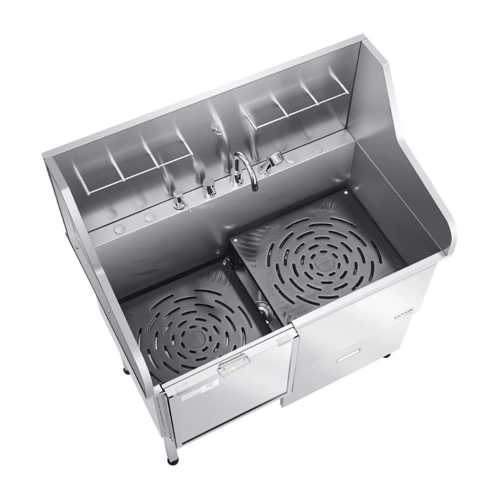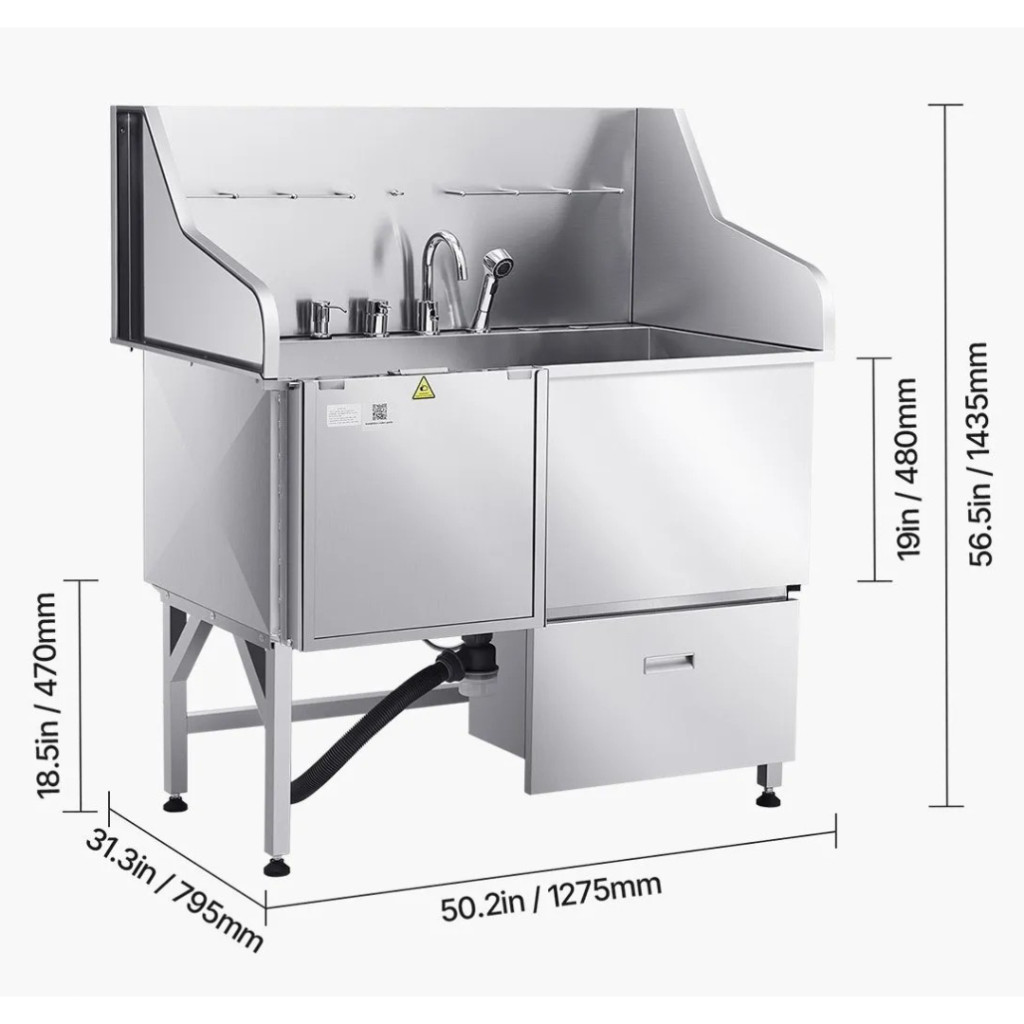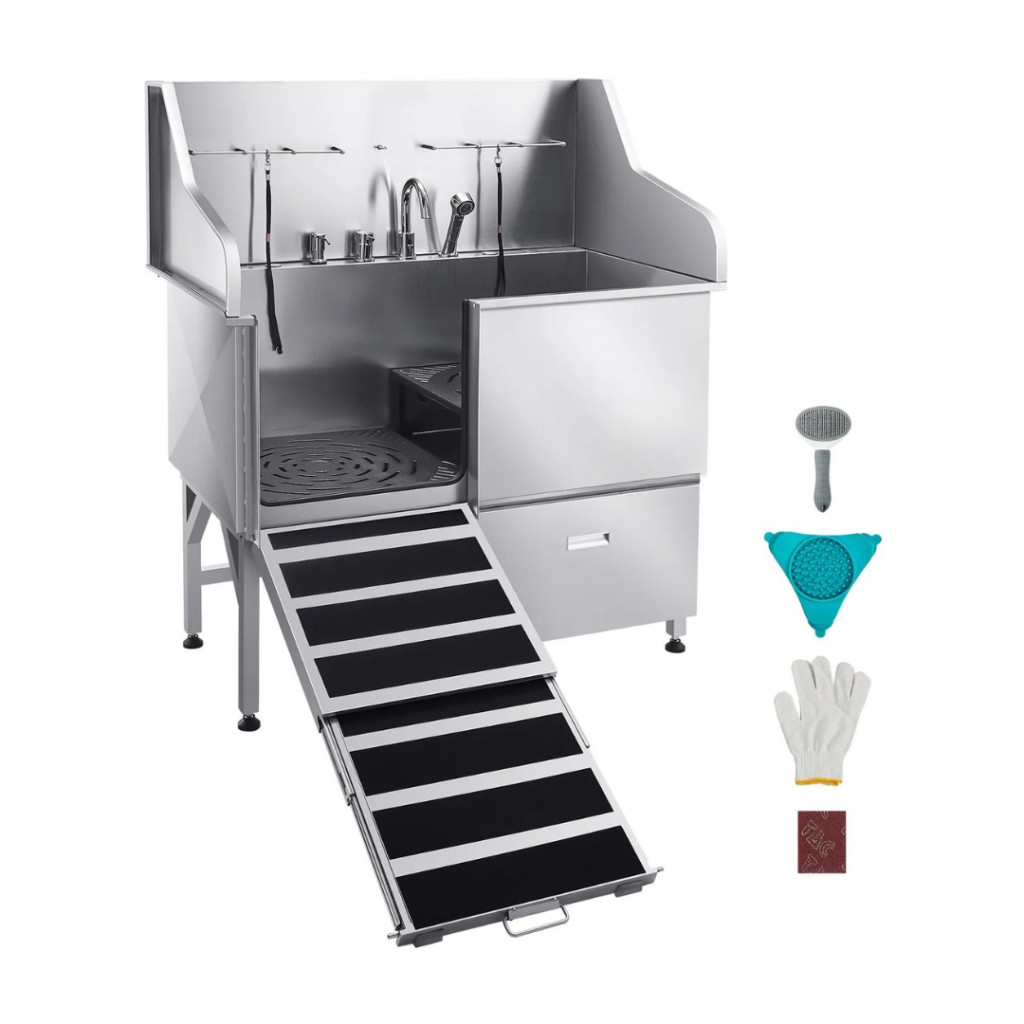Kutyafürdető állomás 127×79,5×143,5 cm kutyakozmetikai kád rámpával, tárolófiókkal, bal oldali ajtóval