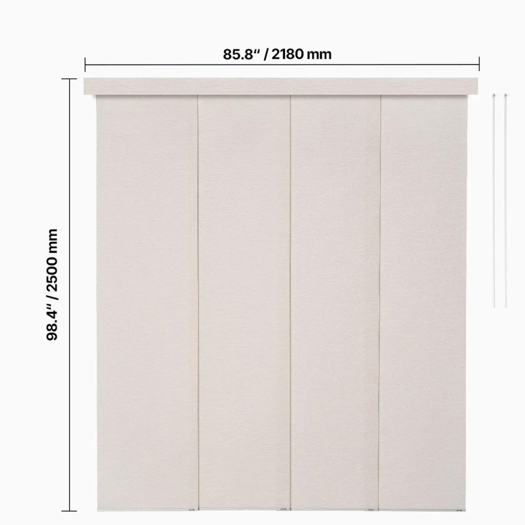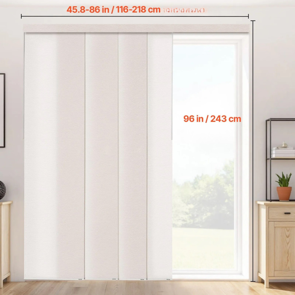 Az állítható alumínium sínrendszer 116–218 cm szélességtartományban használható, így különböző nyílászárókhoz és helyiségekhez is könnyedén illeszthető. A panelek egyedileg méretre vághatók, maximum 243 cm magasságig, ezért a szalagfüggöny pontosan igazítható az adott tér adottságaihoz.