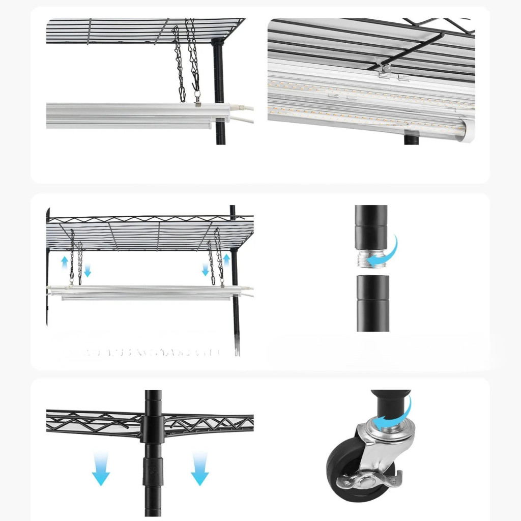A növénynevelő állvány LED világítással erős, 0,9 mm vastag acélcsövekből készül, amelyek stabil és tartós szerkezetet biztosítanak. A porfestett bevonat megvédi a vázat a rozsdától és a korróziótól.