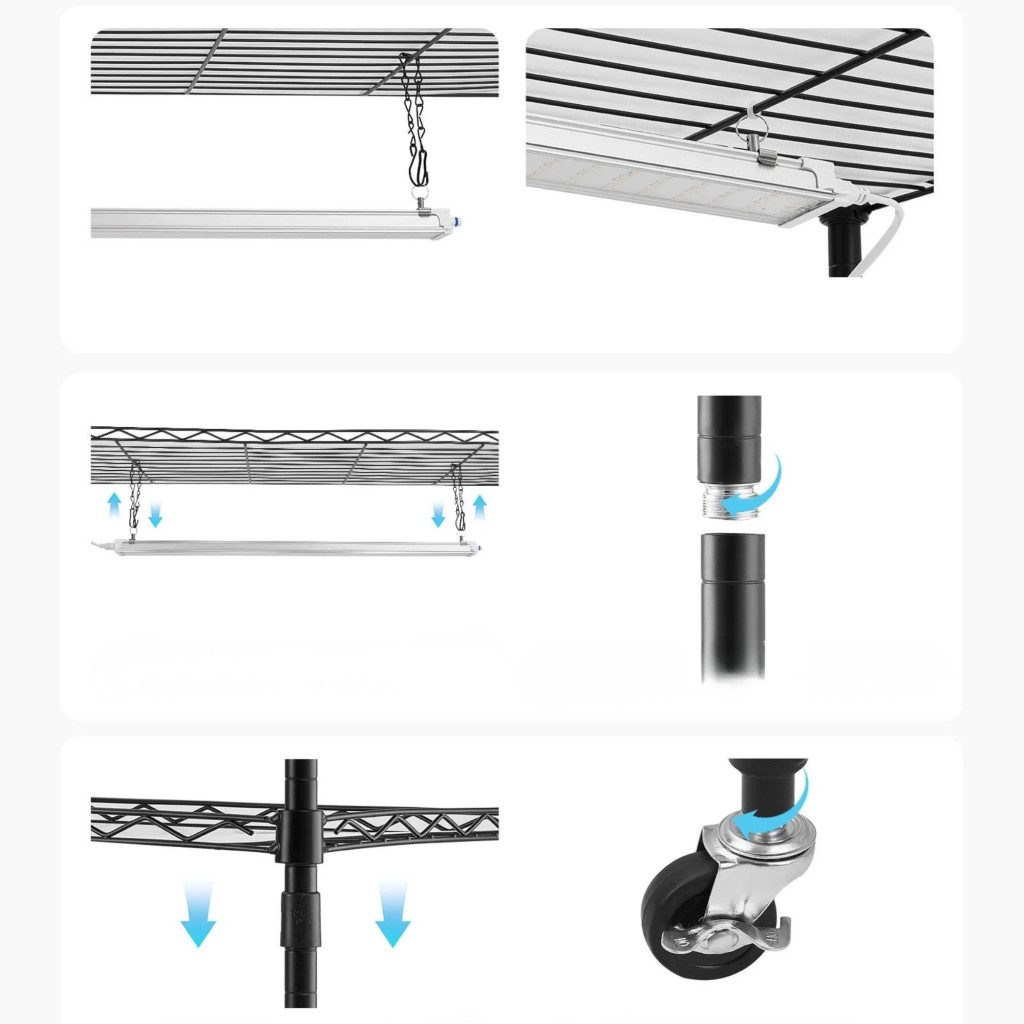 A nagy teljesítményű teljes spektrumú LED növénylámpák segítenek pótolni a természetes napfényt, így növényei akkor is egészségesen fejlődhetnek, ha lakásában kevés a természetes fény. A gurulós növényállvány kialakítás lehetővé teszi az egyszerű mozgatást, így könnyen átrendezheti beltéri mini kertjét.