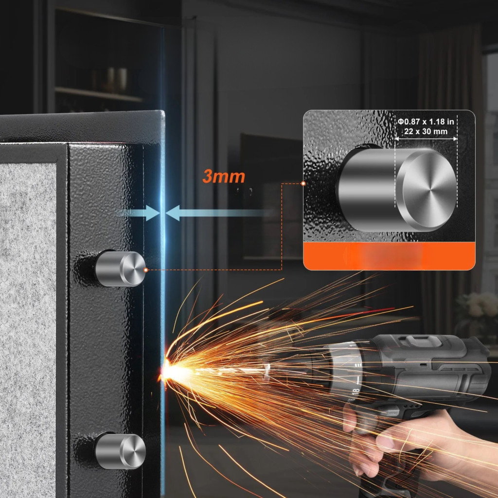 A széf hátoldalán és alján 4–4 előfúrt rögzítőnyílás található, a csomag tartalmazza a szükséges rögzítőcsavarokat. Falhoz vagy padlóhoz rögzíthető a még nagyobb biztonság érdekében.