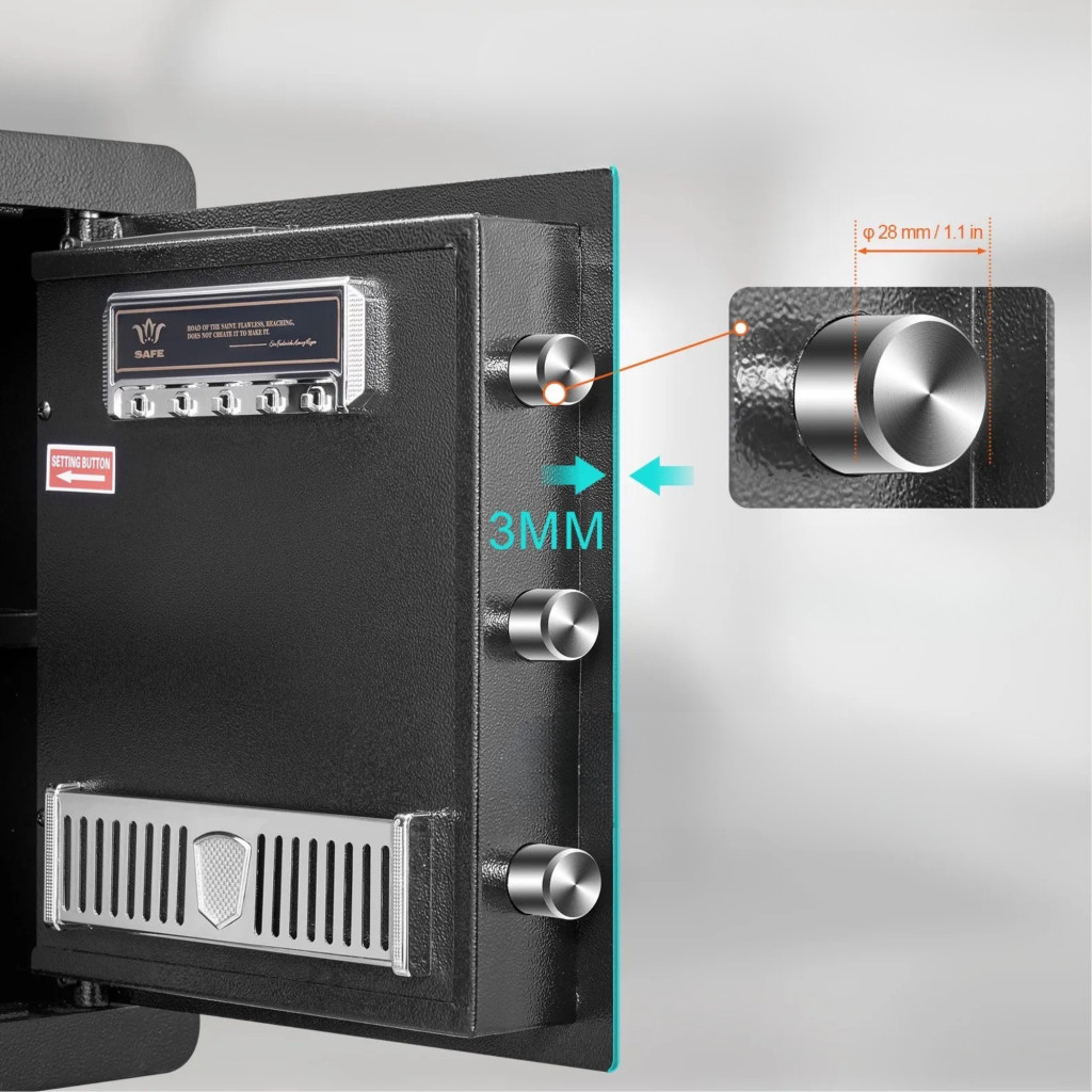 A CE-minősített széf hidegen hengerelt szénacélból készült. Az ajtó vastagsága 3 mm, a zárszerkezet pedig három darab, 28 mm átmérőjű masszív zárócsappal rendelkezik, amely hatékony védelmet nyújt illetéktelen behatolás ellen.