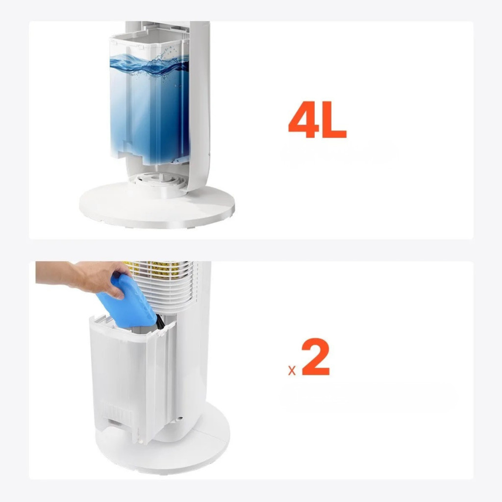 A 4 literes víztartály hosszabb üzemidőt tesz lehetővé utántöltés nélkül. A jégakku-tartó tovább fokozza a hűtési hatást, így a készülék nemcsak ventilátorként, hanem párásító ventilátorként is hatékonyan használható.