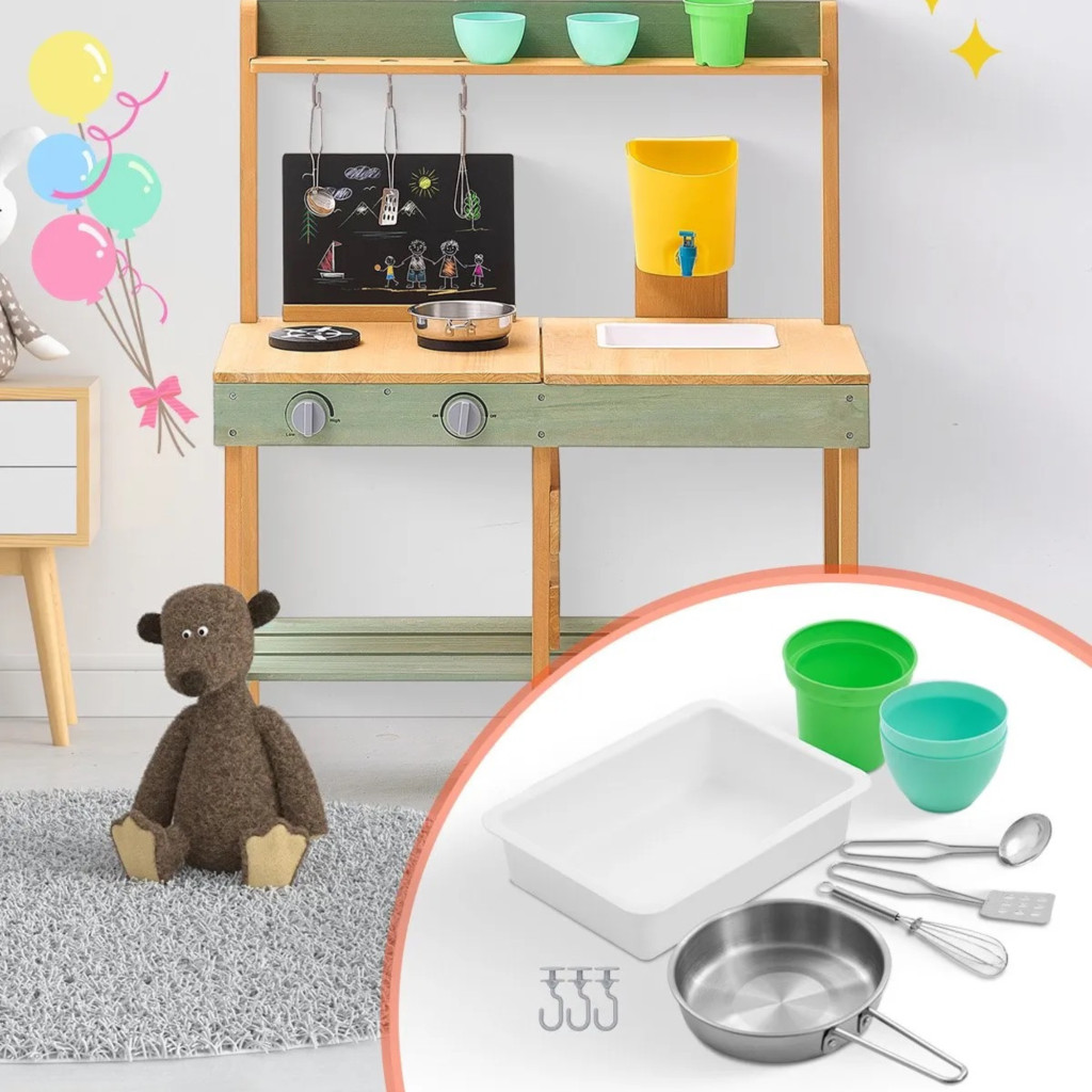 A gyerek játékkonyha kiegészítőkkel 11 darabos készlettel érkezik: