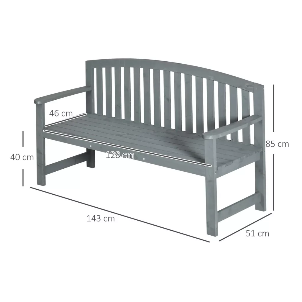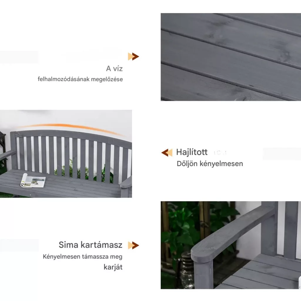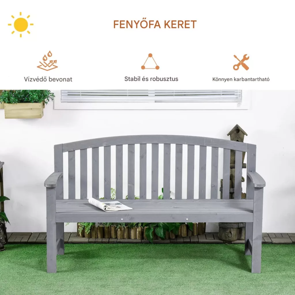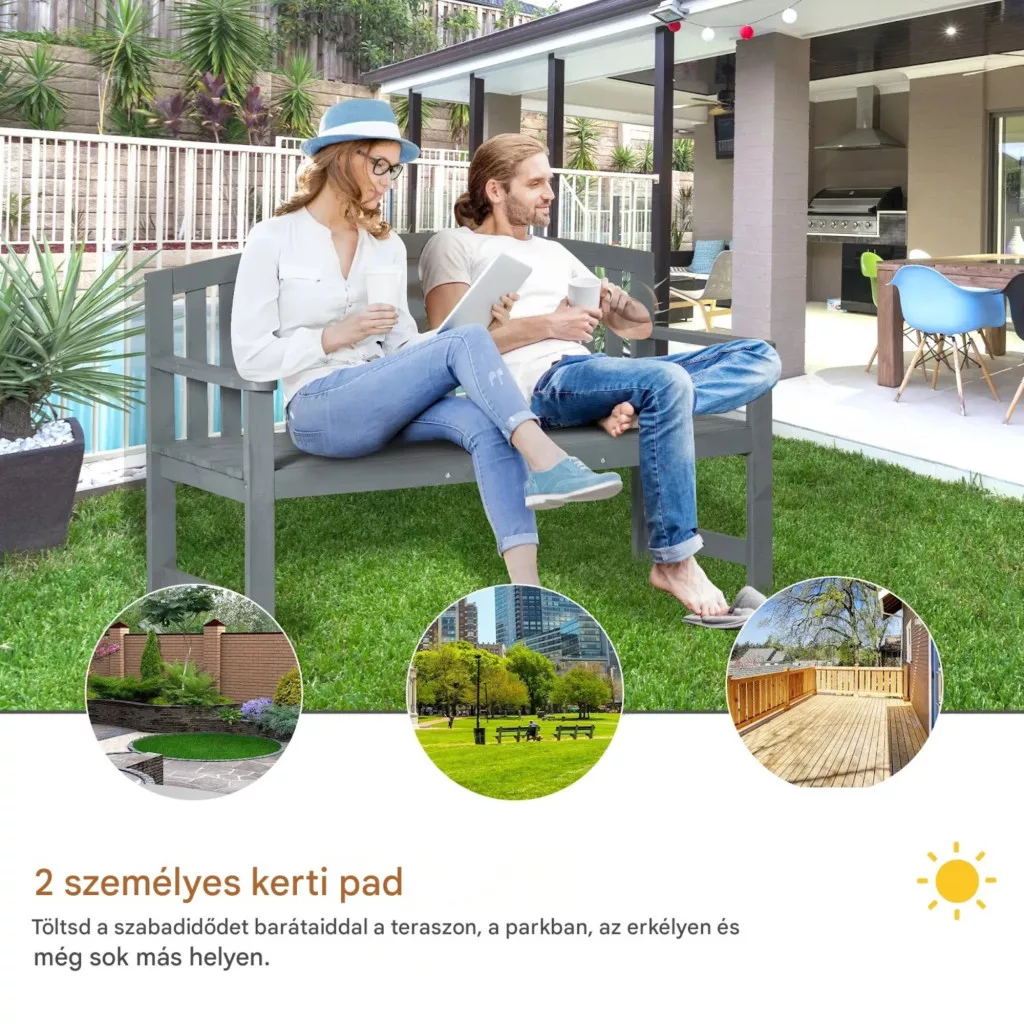 Fa kerti pad 2 személyes kerti pad háttámlával időjárásálló 240 kg teherbírás 143x51x85 cm szürke