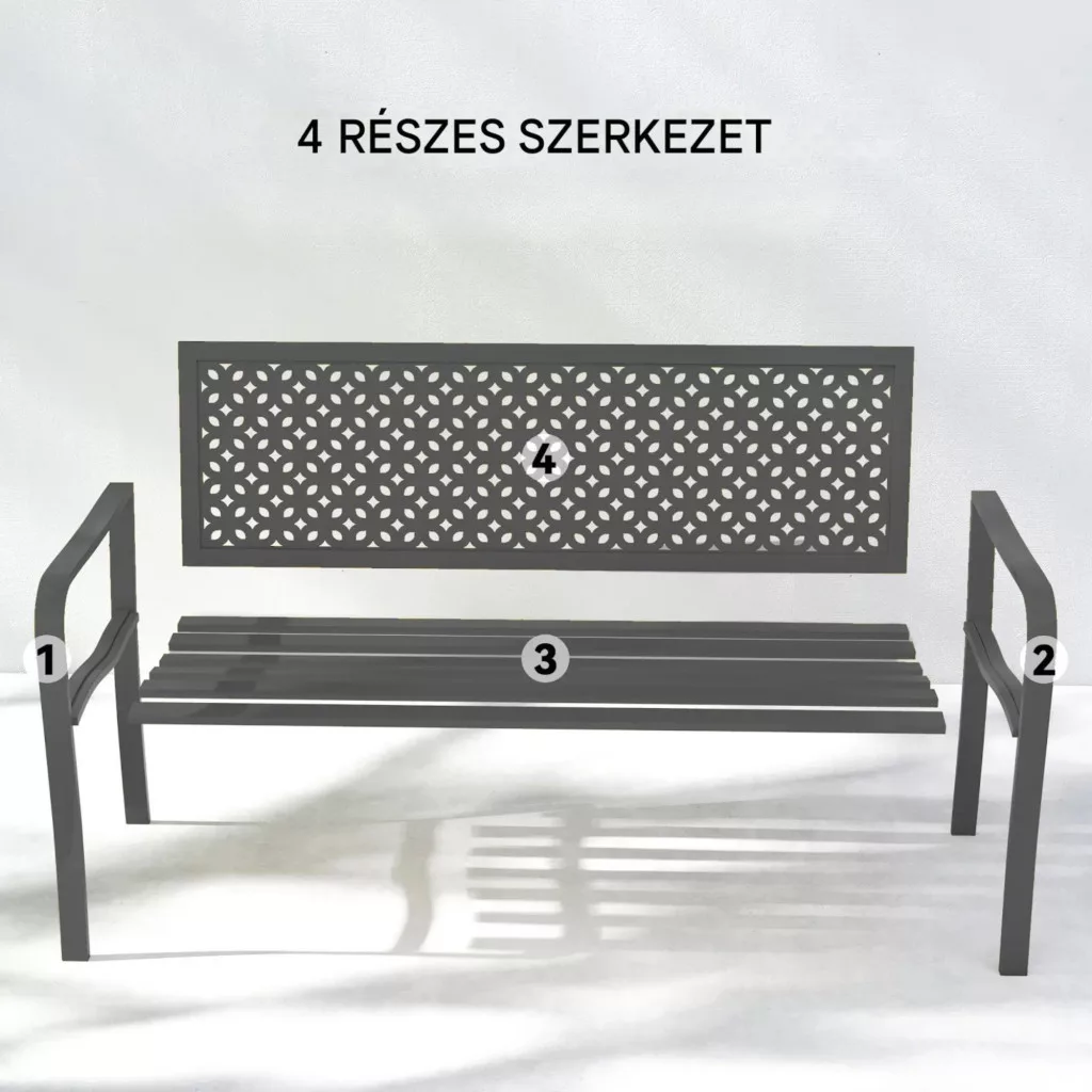 Ez a modern kialakítású fém kerti pad porfestett acél vázzal és elektrofórézissel kezelt háttámlával készült, amely hatékony védelmet nyújt a rozsdásodás ellen. Ideális választás kültéri használatra, akár napsütésben, akár esős időben.