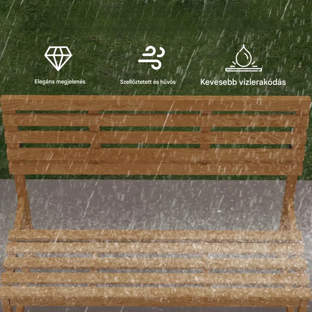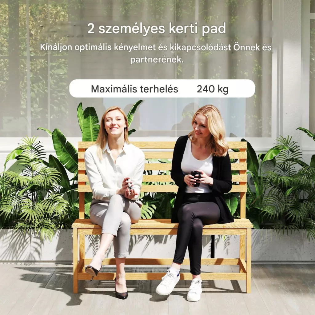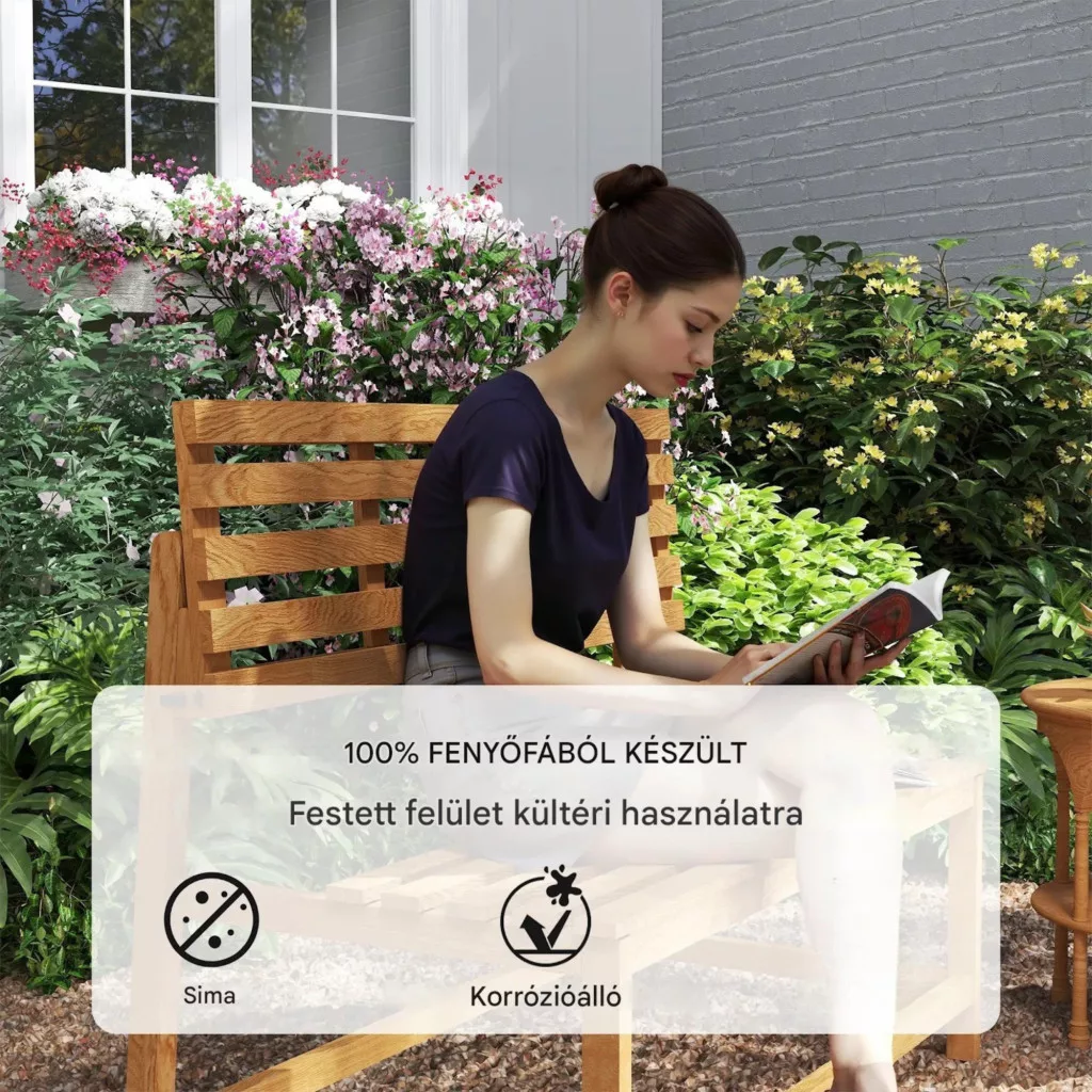 A lakkozott fenyőfa kerti pad természetes megjelenést és hosszú élettartamot biztosít. Az UV-álló bevonat védi az anyagot az időjárás hatásaitól, így kültéri használatra kiváló választás.