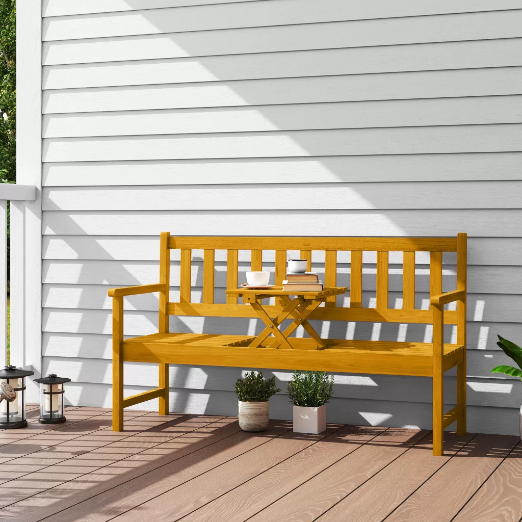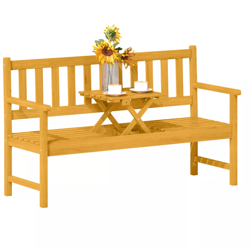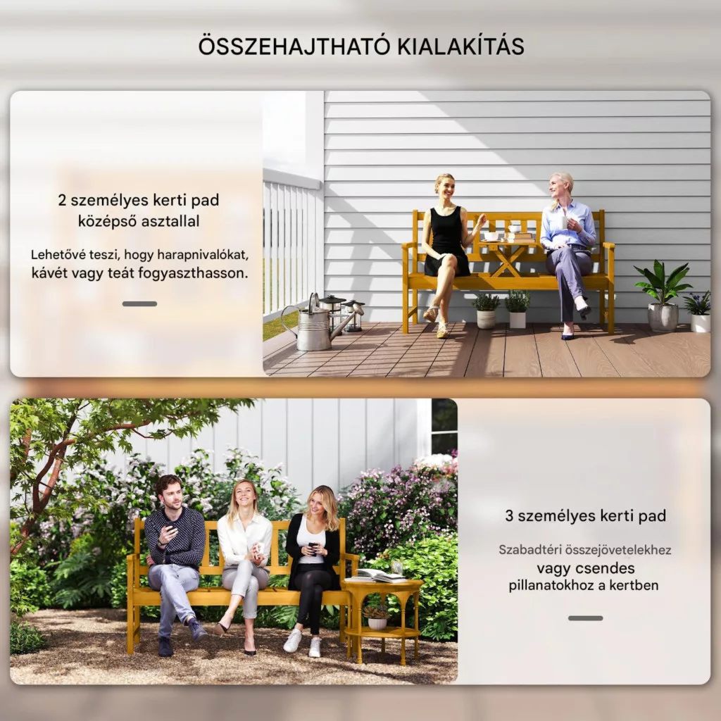 Fa kerti pad asztallal 149x56,5x89 cm 2-3 személyes kerti pad, lehajtható középső asztallal, teak szín