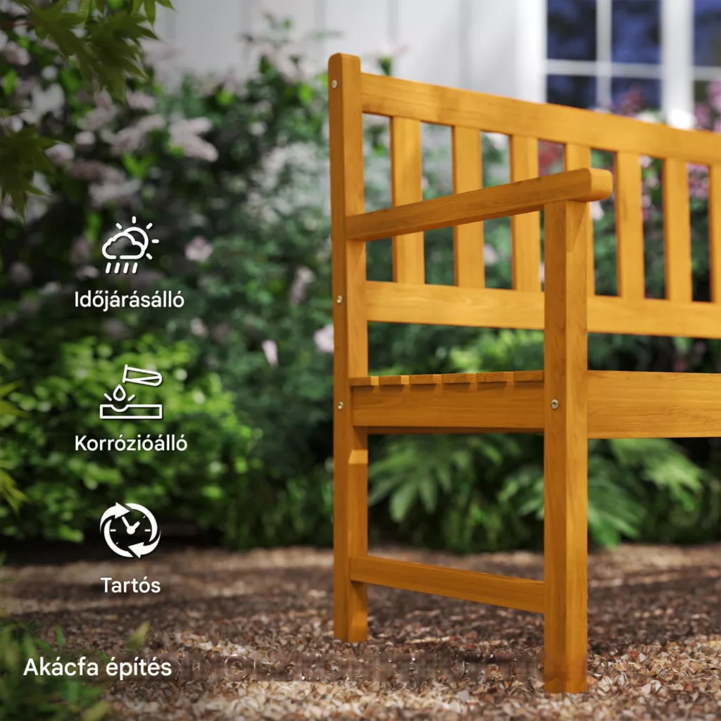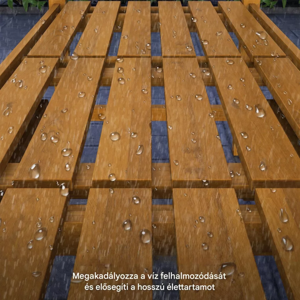 A tömör akácfa kerti pad nemcsak esztétikus, hanem kiemelkedően tartós is. Az akácfa természetes ellenálló képessége biztosítja, hogy a pad hosszú éveken keresztül megőrizze formáját, miközben ellenáll az időjárási hatásoknak is. A lamellás kialakítás segíti a víz gyors elvezetését, így a bútor eső után is hamar használatra kész.