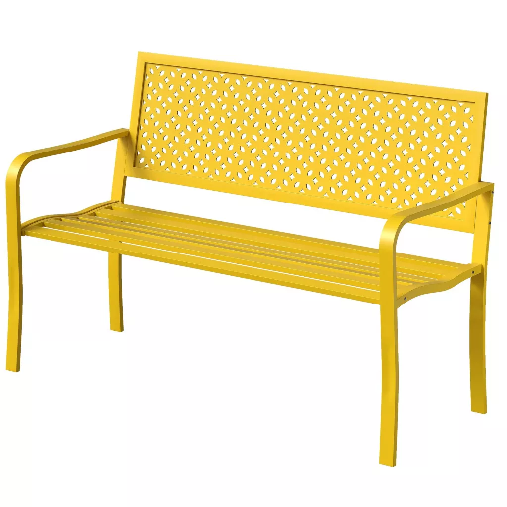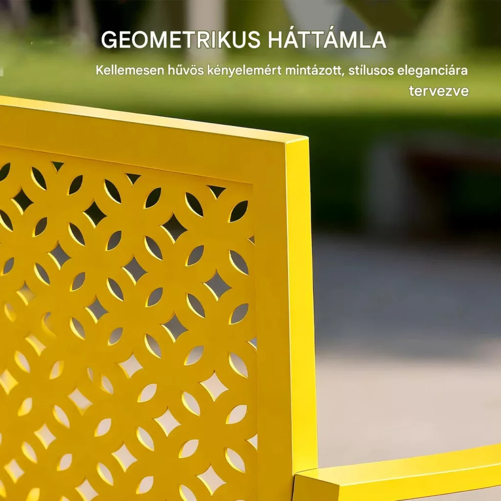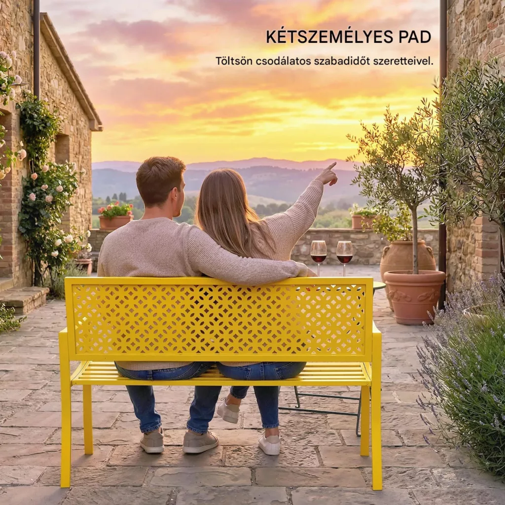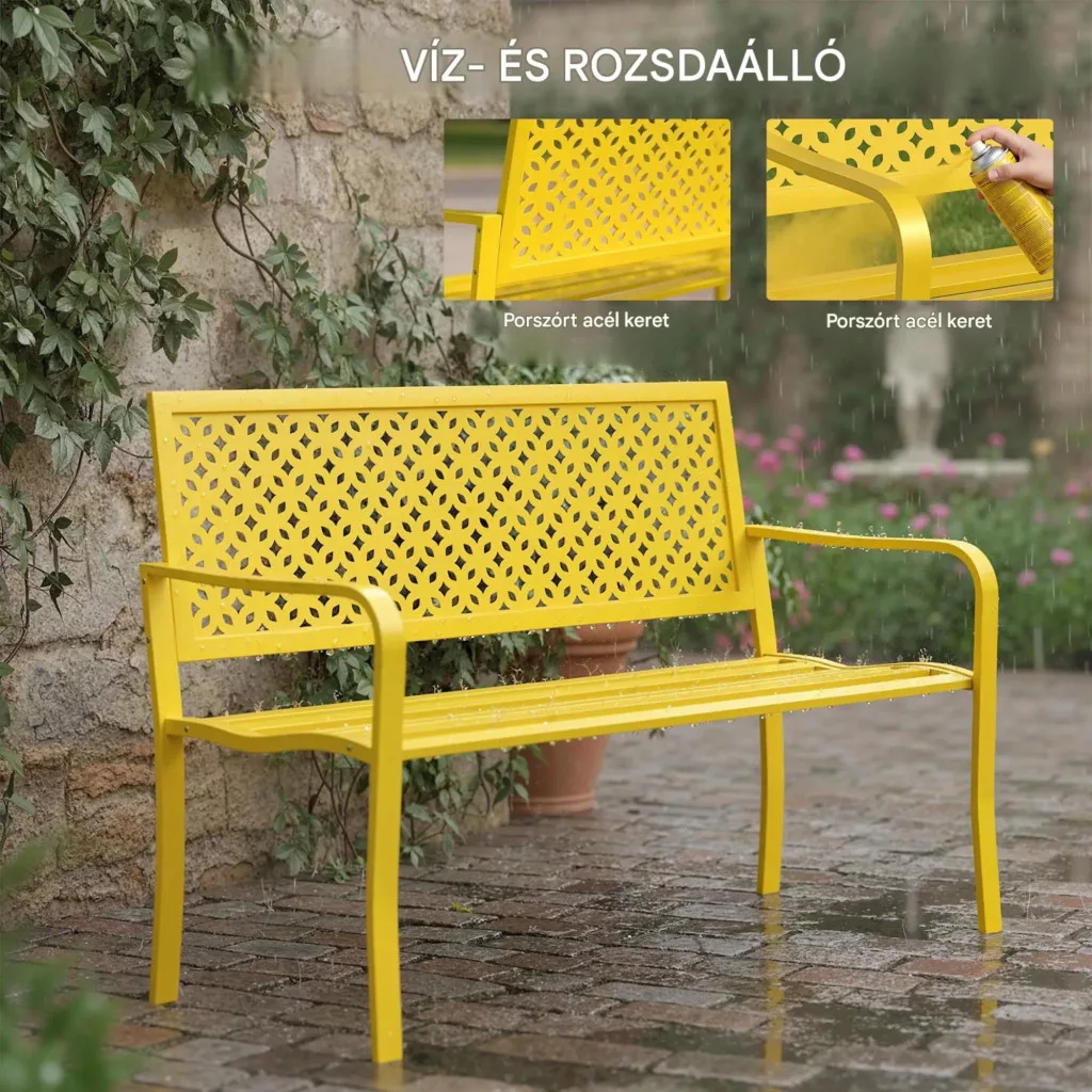 Kerti pad 2 személyes fém kerti pad háttámlával, időjárásálló, sárga 240 kg teherbírás