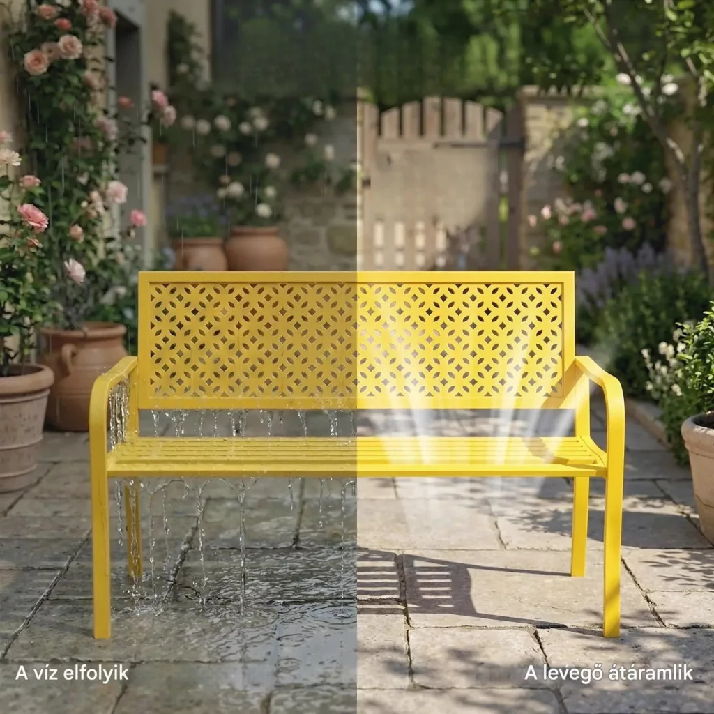 A lamellás ülőfelületű kerti pad megakadályozza a víz felgyülemlését, így gyorsan szárad és mindig használatra kész marad.