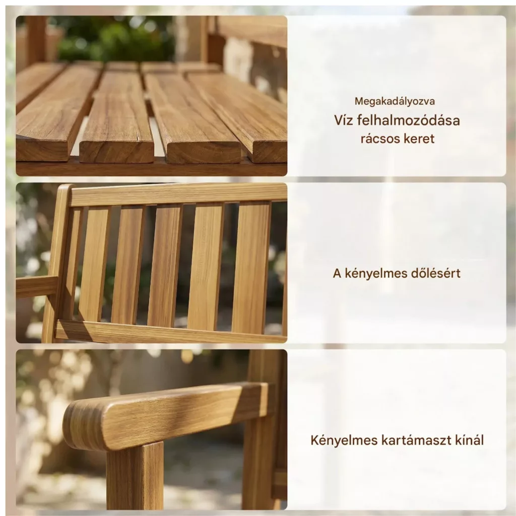 A masszív fa szerkezet és a teak színű kivitel biztosítja a hosszú élettartamot és a harmonikus megjelenést.