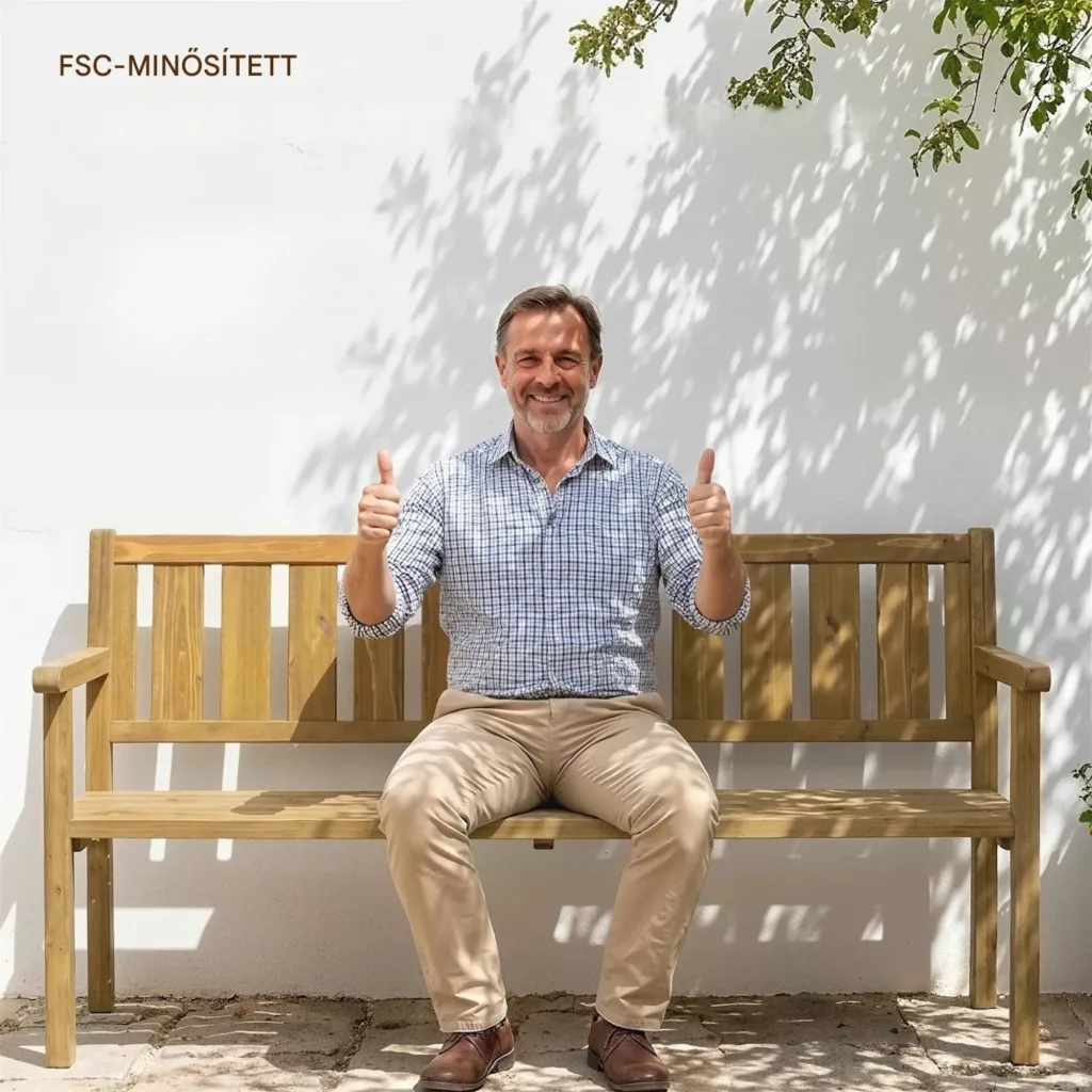 Ez a prémium kivitelű fa kerti pad vastag, stabil fenyőfa vázzal készült, amely akár 360 kg teherbírást biztosít. A lamellás kialakítás elősegíti a víz elvezetését és a megfelelő szellőzést, így a pad minden időjárási körülmény között megbízhatóan használható.