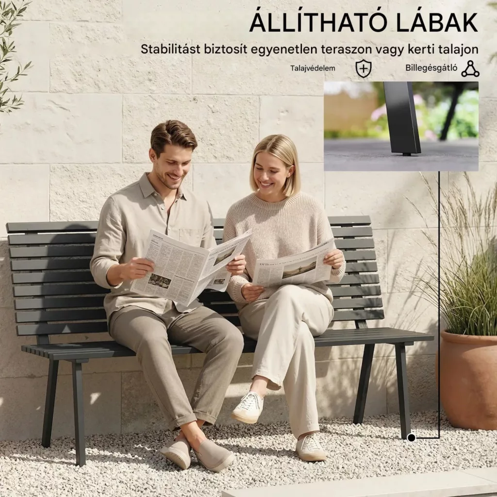 A beépített állítható talpak lehetővé teszik, hogy a kerti pad egyenetlen felületen is stabilan álljon. Ez különösen fontos kültéri használat esetén, ahol a talaj nem mindig teljesen sík.