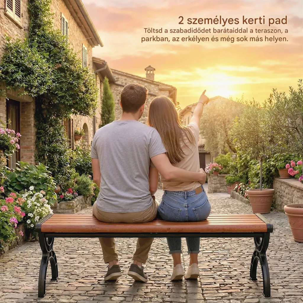 A 124 cm széles kerti pad kényelmes helyet biztosít két fő számára. Ideális pihenéshez, beszélgetésekhez vagy akár rövid kikapcsolódáshoz a szabadban.