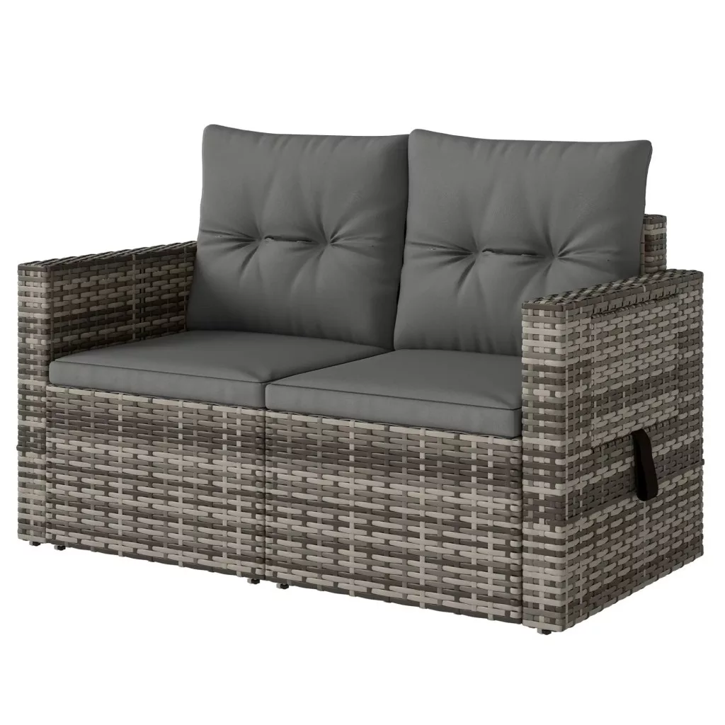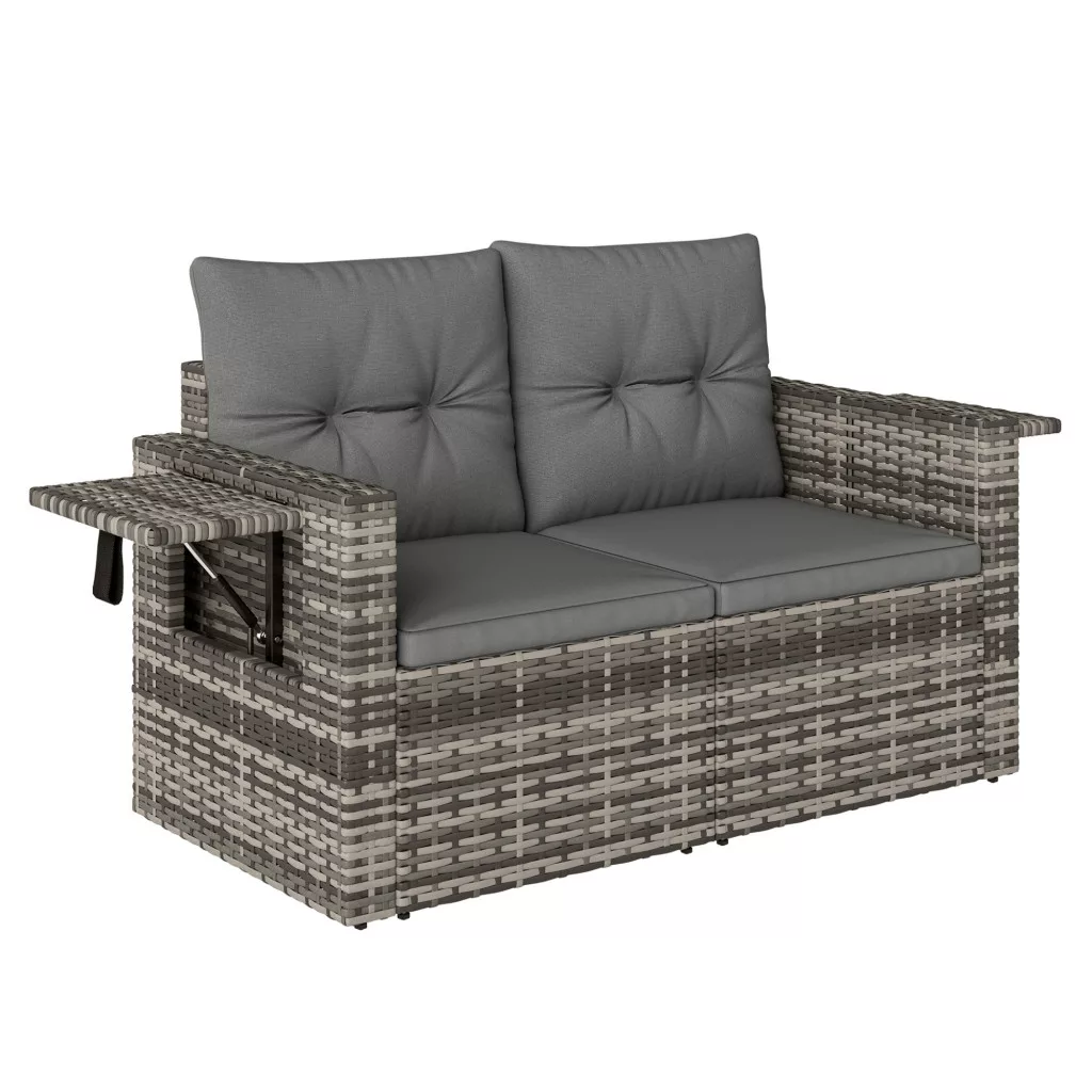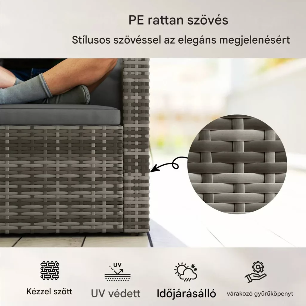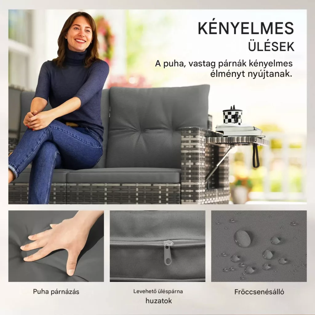 Kerti rattan kanapé 2 személyes átalakítható, kihajtható oldalsó asztalokkal, párnával kültéri ülőgarnitúra, világosszürke