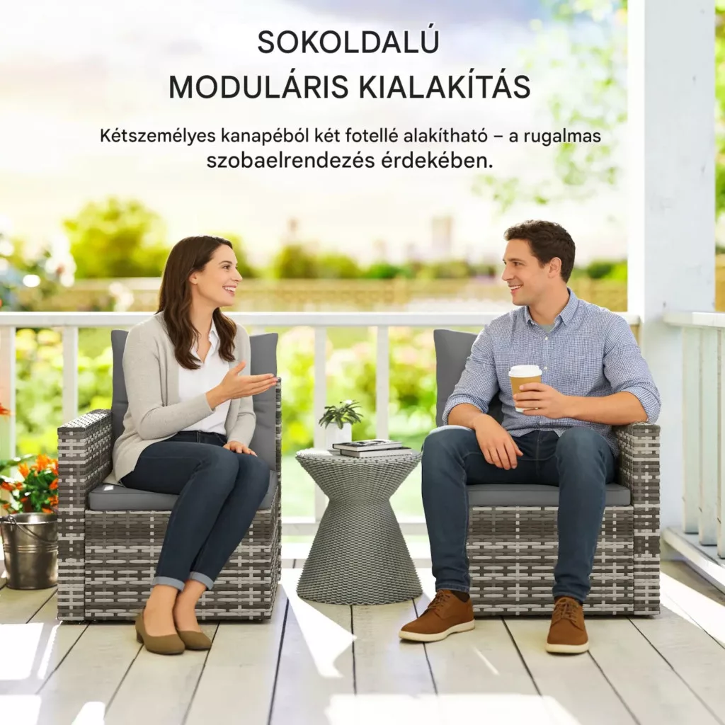 Ez az innovatív 2 személyes rattan kerti kanapé igény szerint két különálló fotellé alakítható, így maximális rugalmasságot biztosít. Tökéletes választás kisebb teraszokra, erkélyekre vagy akár beltéri használatra is.