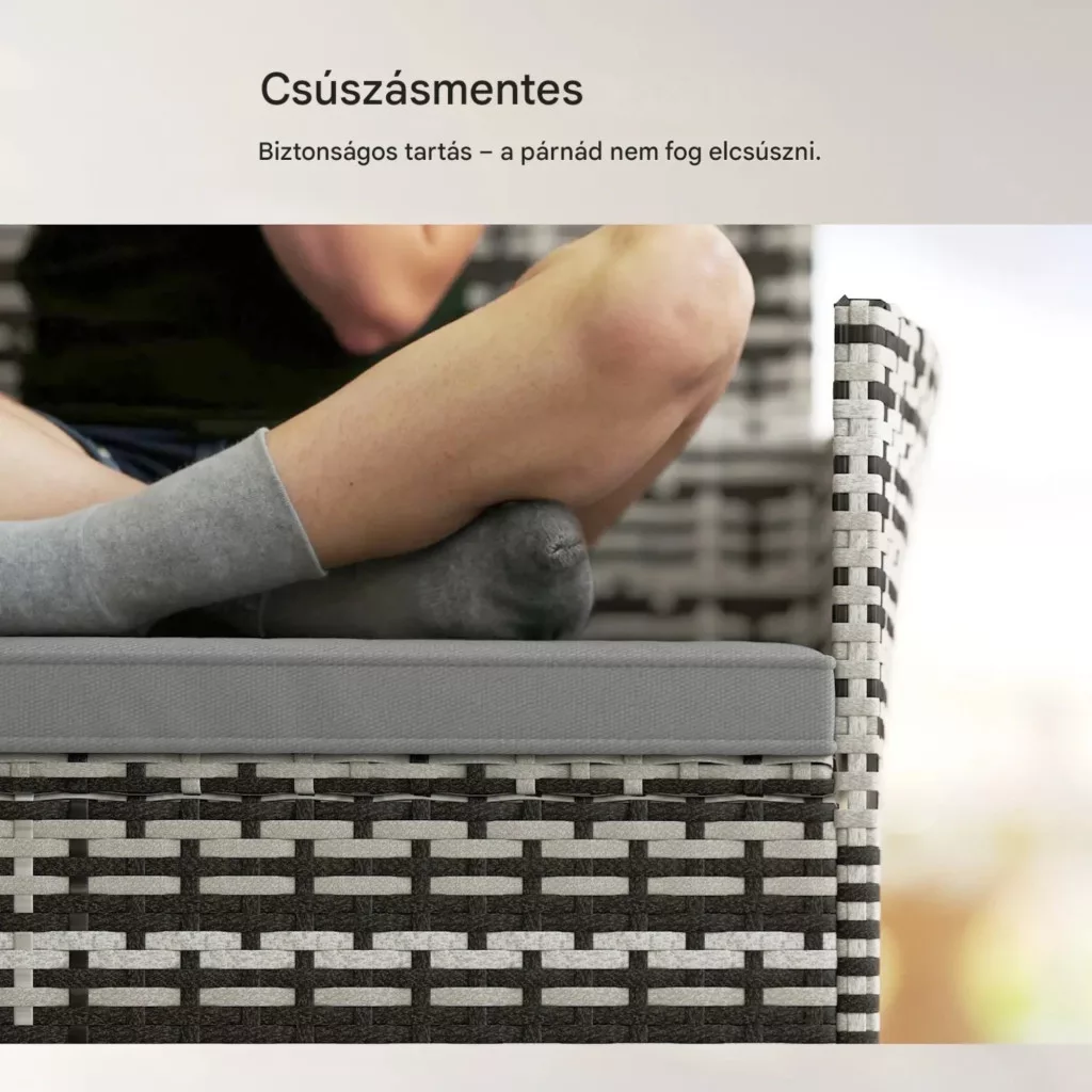 A puha, vastag szivacsos ülőpárna kényelmes ülést biztosít hosszabb pihenés során is. A karfák extra kényelmet nyújtanak, míg a csúszásgátló alátétek gondoskodnak arról, hogy a párna mindig a helyén maradjon.