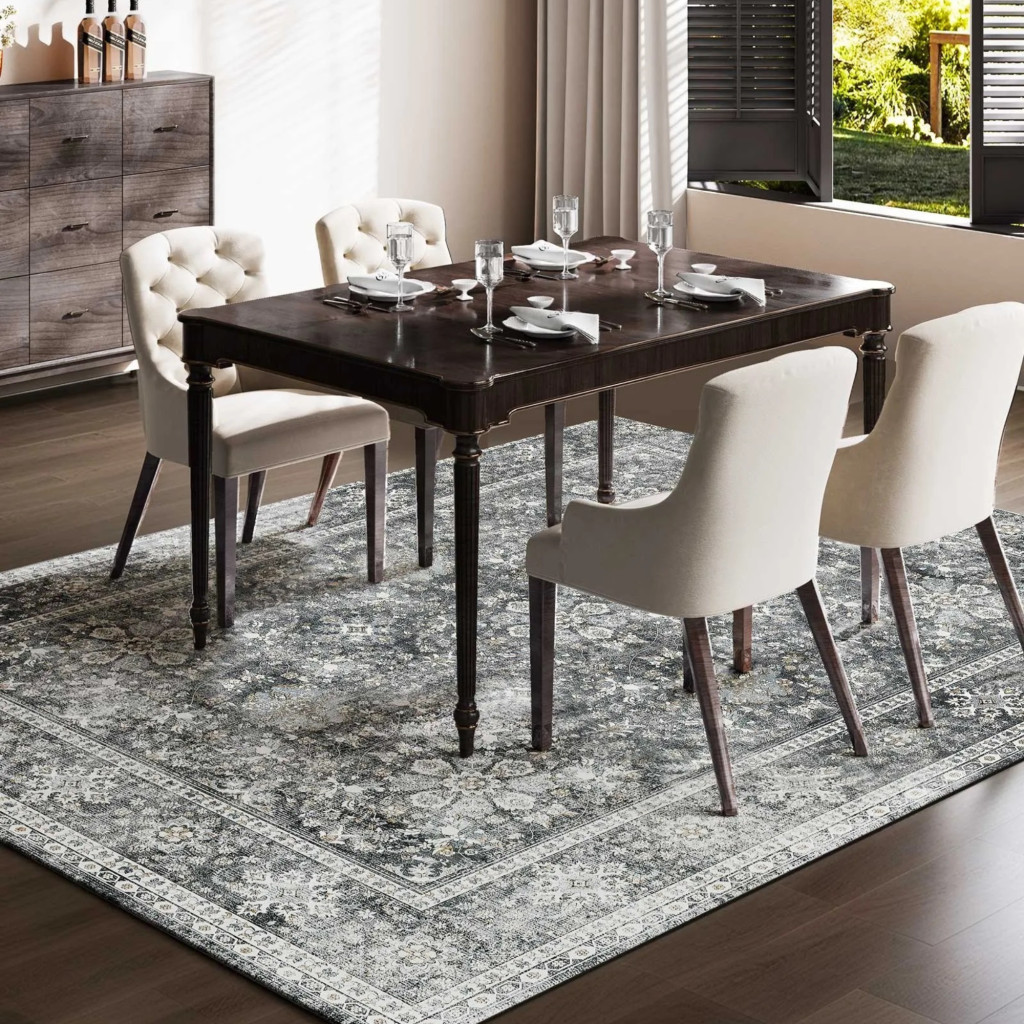 Vintage stílusú nappali szőnyeg 244x305 cm mosható, csúszásmentes, rövid szálú felületszőnyeg szürke színben