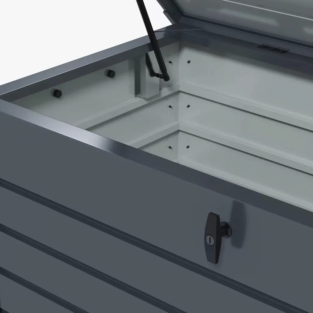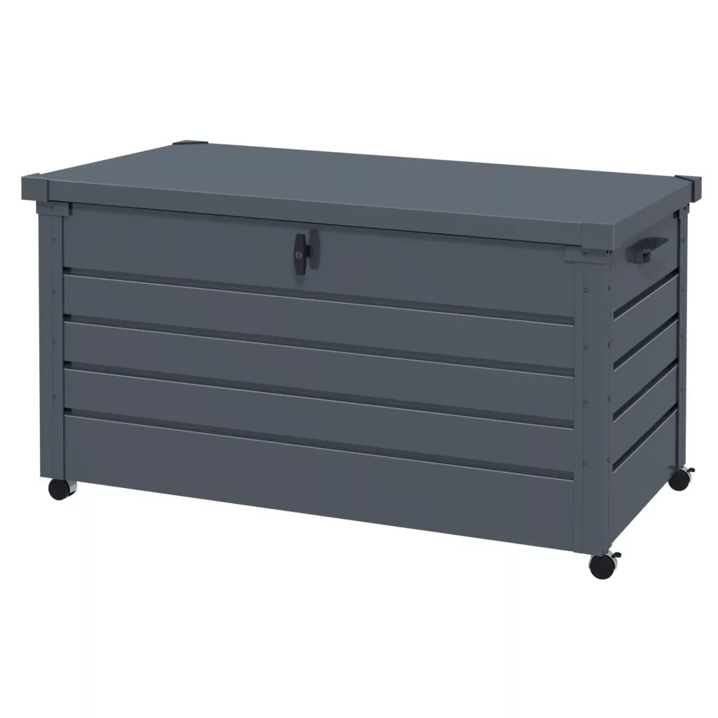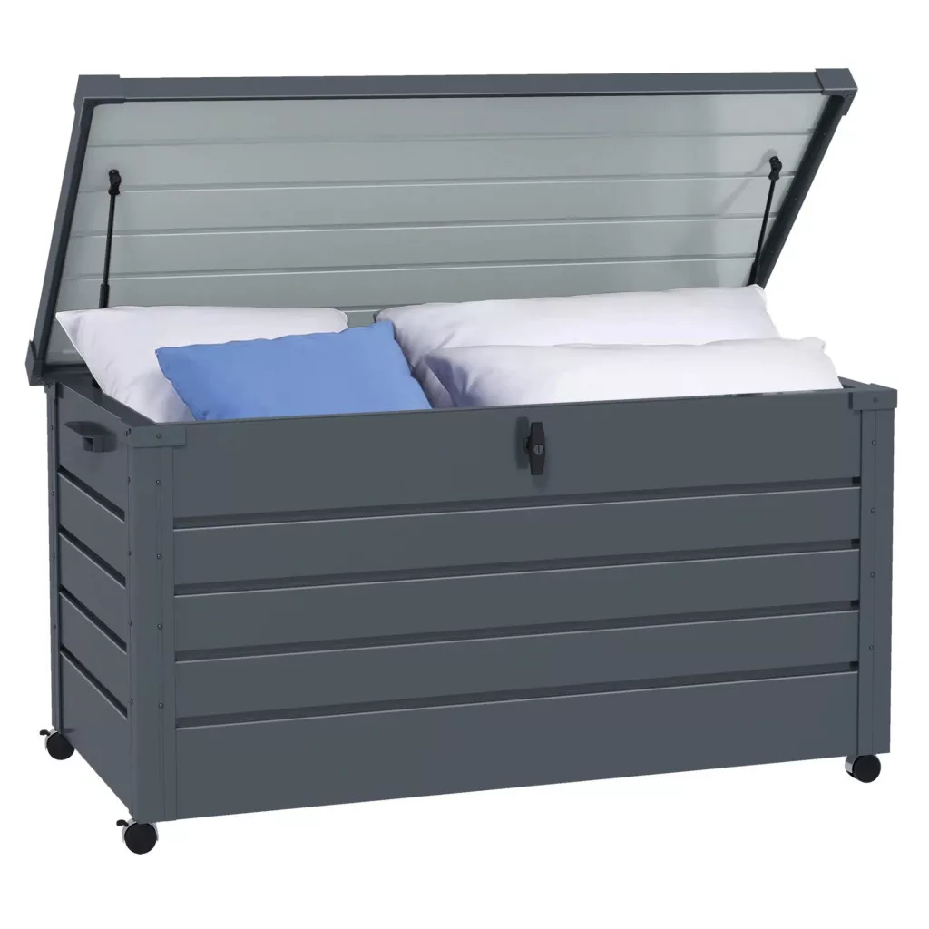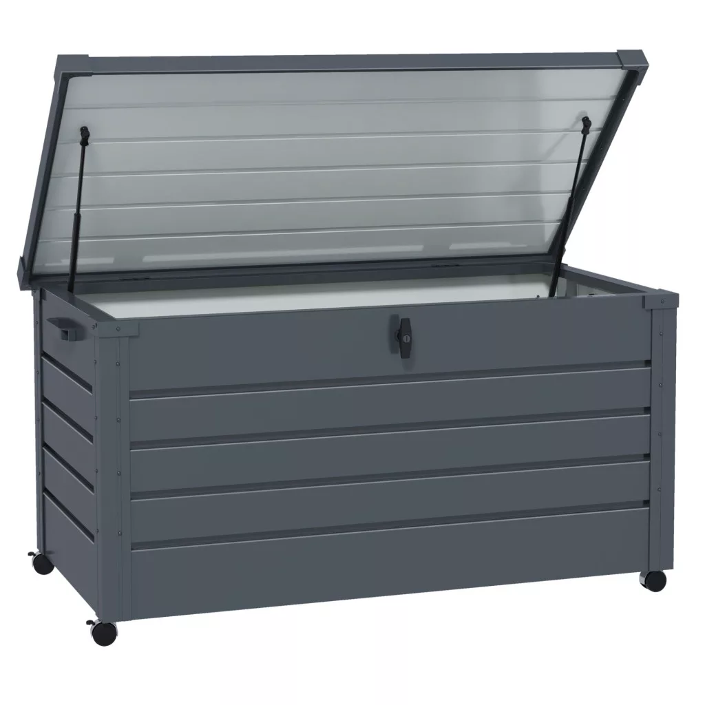 Ez a 311 literes kerti tároló láda ideális választás a kerti bútorpárnák, szerszámok és kültéri kiegészítők rendszerezett tárolására. A kültéri kerti párnatartó box masszív, horganyzott acél szerkezettel készült, amely ellenáll az időjárás viszontagságainak, miközben praktikus és modern megoldást kínál a kertben vagy a teraszon.