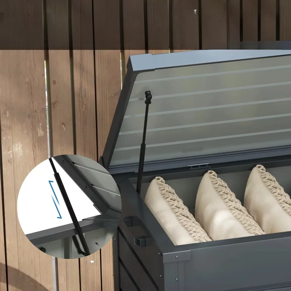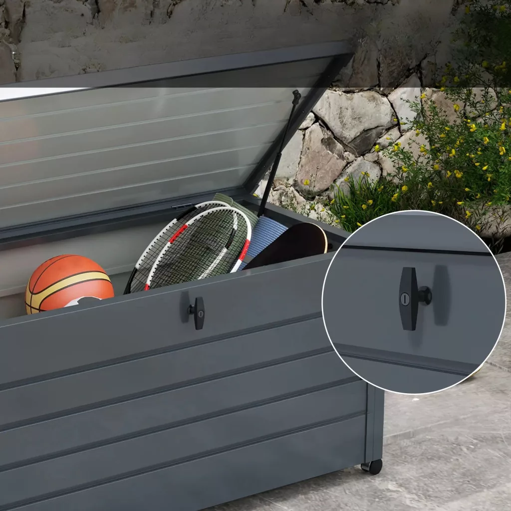 A kerti tároló láda 311L bőséges belső teret biztosít különböző kültéri tárgyak számára.