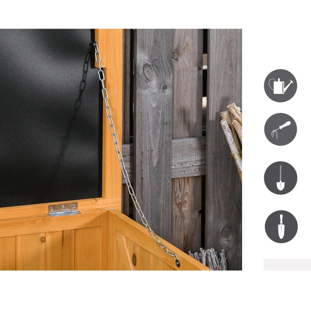 A fenyőfából készült kerti tároló box stabil és tartós konstrukcióval rendelkezik.